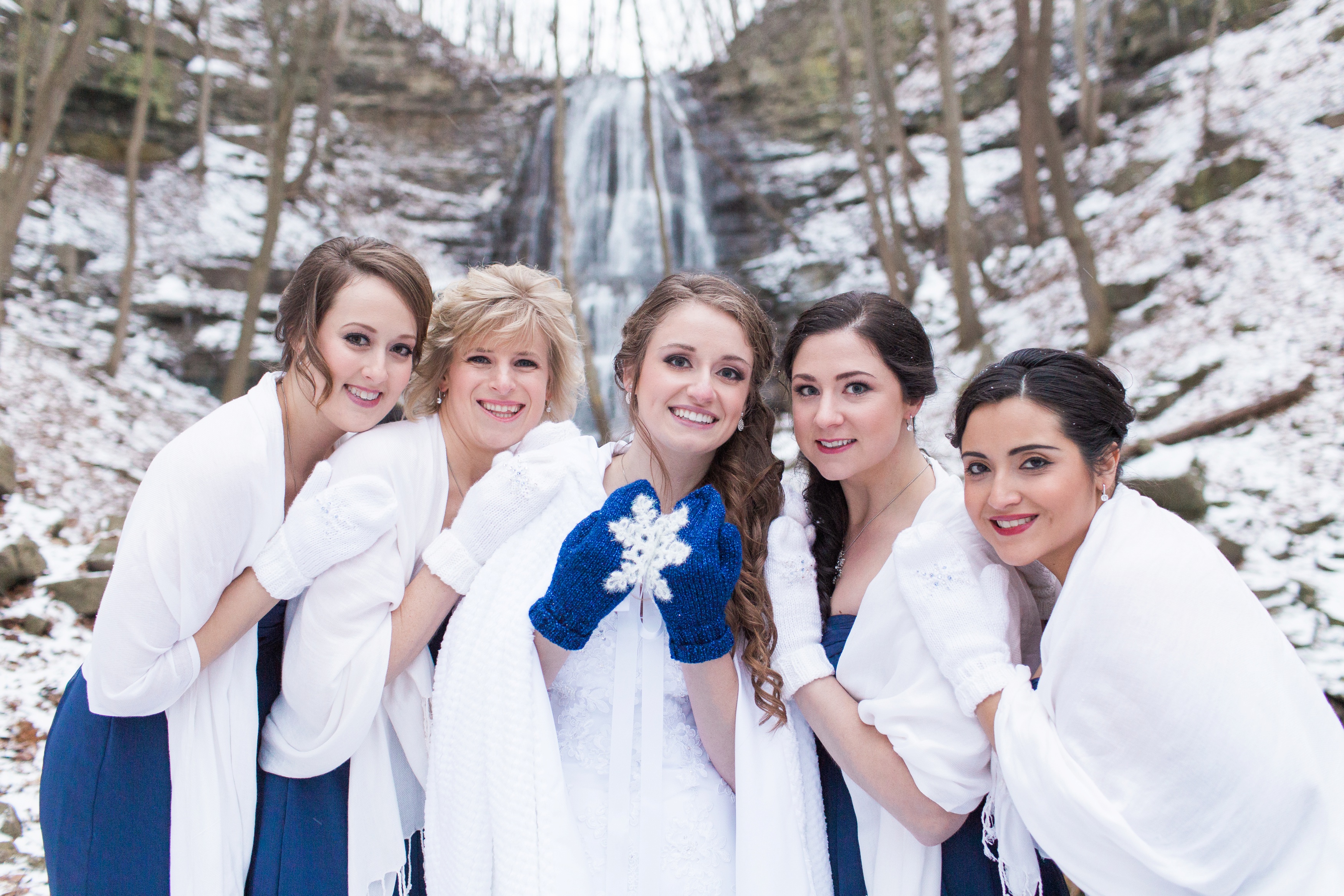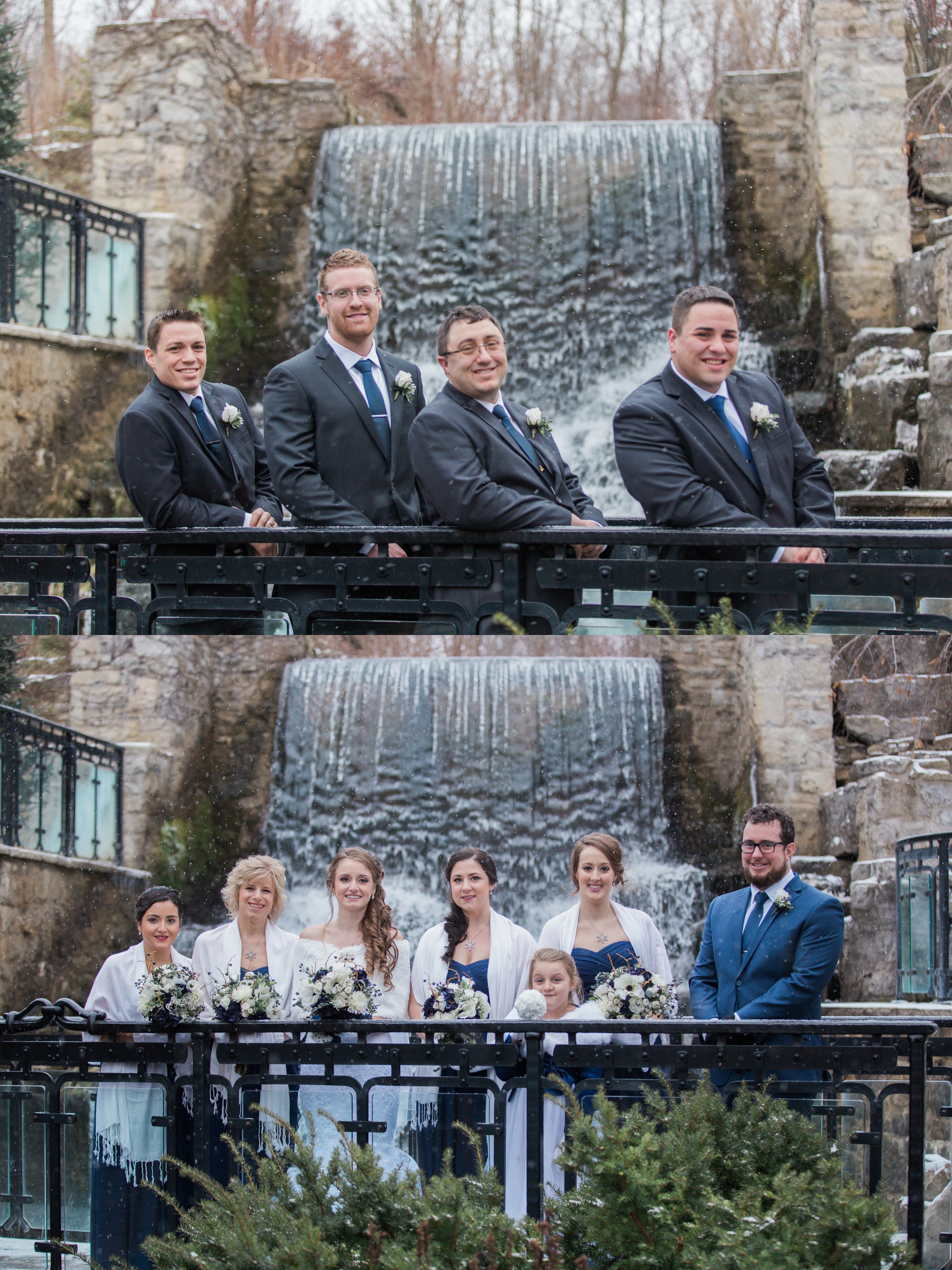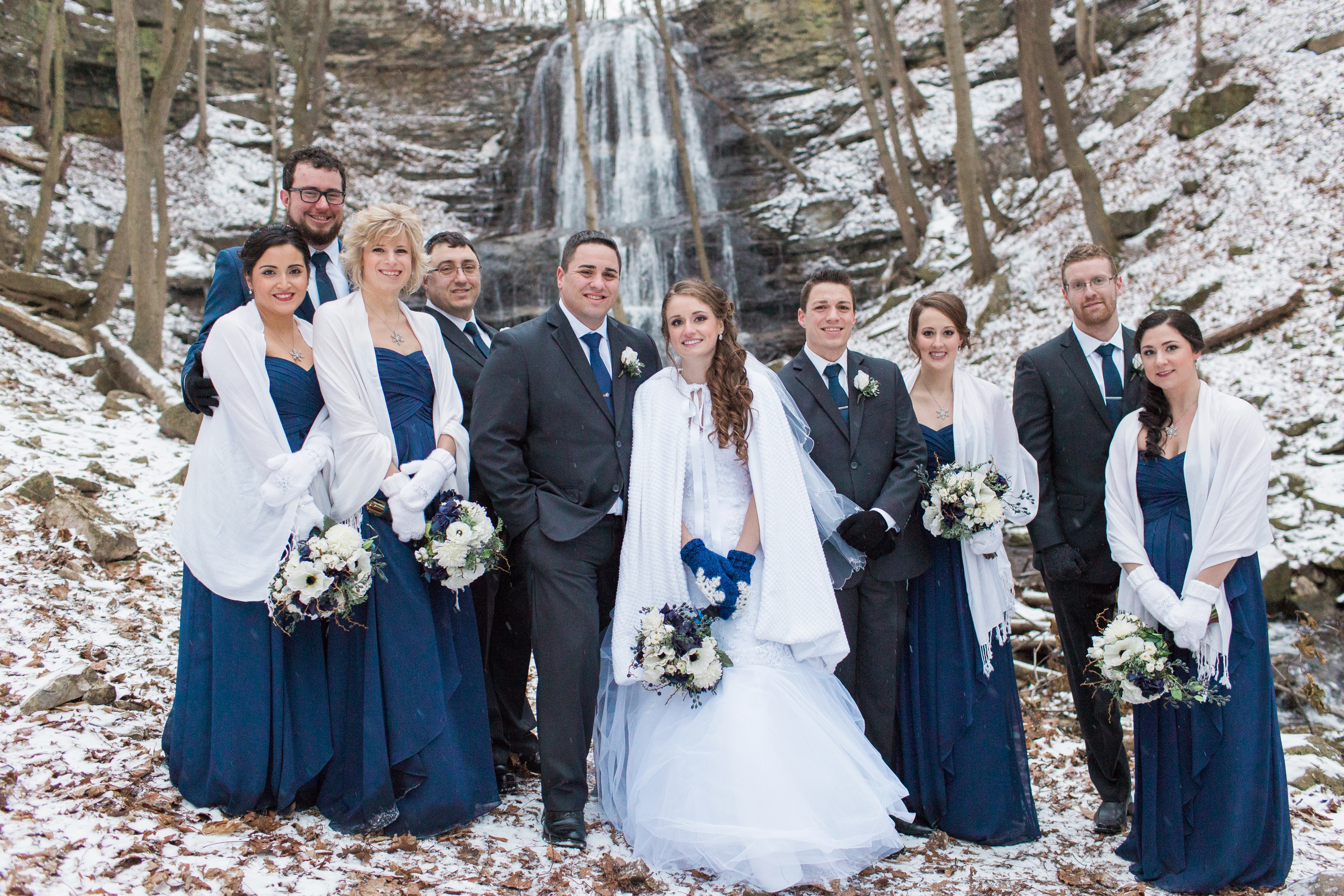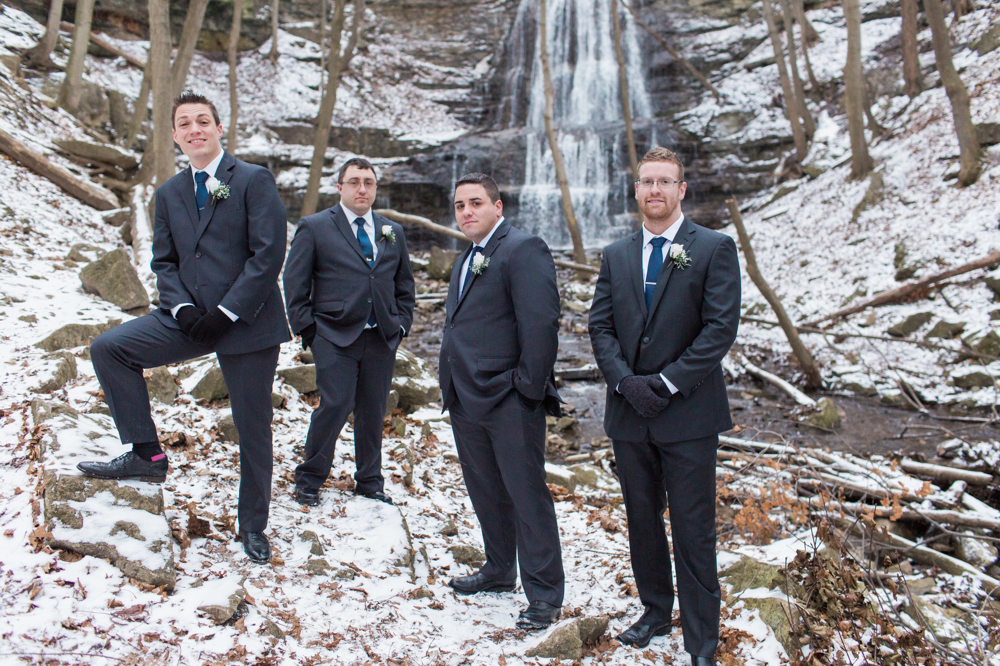 Where do I even begin to describe this beautiful Ancaster Mill Wedding? Nicole & Pete had a very beautiful winter wedding at one of the Pearle Wedding and Events venues this past Saturday. It was a beautiful winter day and the snow was falling so magically. To my surprise upon arrival, there were many magical Disney touches spread throughout the day. From decor to their vows, it was Disney inspired. Obviously, I was super excited for the unexpected surprise. It is without a doubt that Nicole did not overlook a single detail. I think the thing I loved most was her blue sparkle mittens that her grandmother had stitched snowflakes onto to go with her winter wedding theme. I can say without a doubt, that Pete’s reaction to seeing Nicole during their first look is hands down the best expression I have ever seen. For a moment there it was a little touch and go if he would be my first groom to faint, but he, as their hankies said, Kept his shit together. For wedding party photos we spent some time on the grounds at the Ancaster Mill but also took a small drive down the road to Sherman Falls. This beautiful waterfall added a unique backdrop for their wedding day photos.