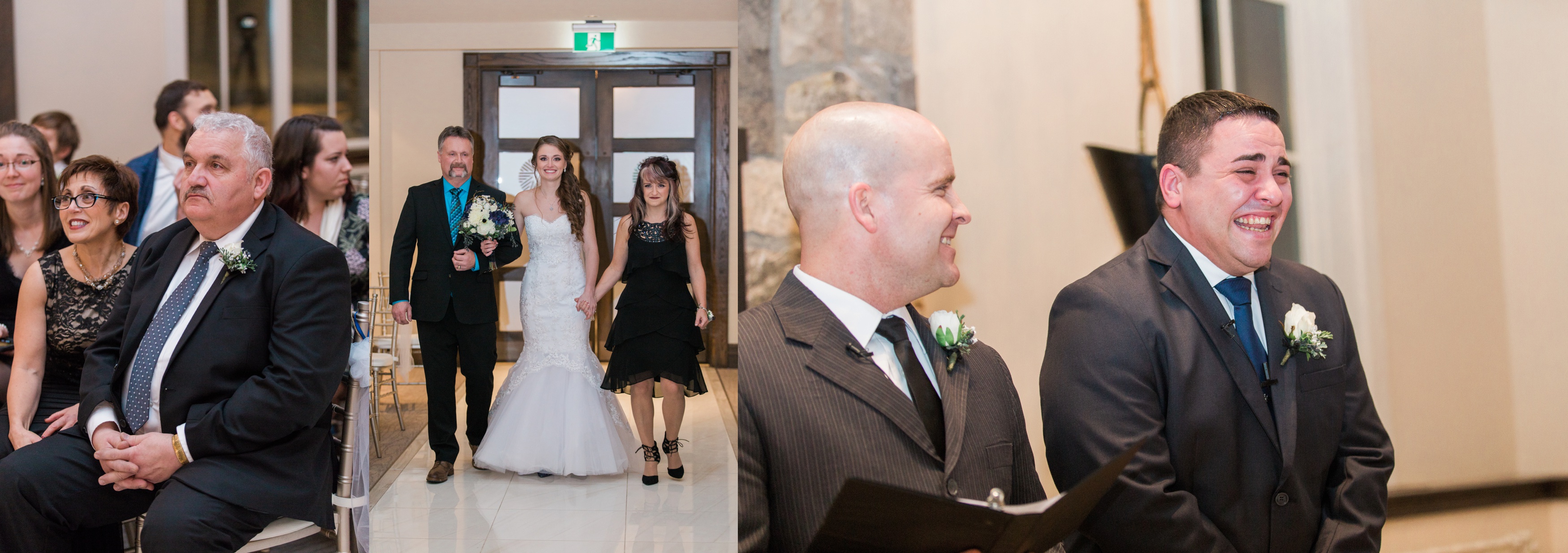Soon it was ceremony time. With the lights dimmed and the disney instrumentals playing guests quietly entered the Ancaster Mill chapel and found their seats. Again, with all eyes on Pete as Nicole made her entrance, he had the most perfect reaction to his bride making her way down the aisle to him. Nicole, absolutely stunning in her gown, had her parents by her side. With the exchanging of rings, the reading of vows, the signing of the registry and a beautiful sand ceremony, it was time for the first kiss as husband and wife to seal the deal. With excitement in their eyes and love in their hearts the newlyweds made their way down the aisle as a married couple.