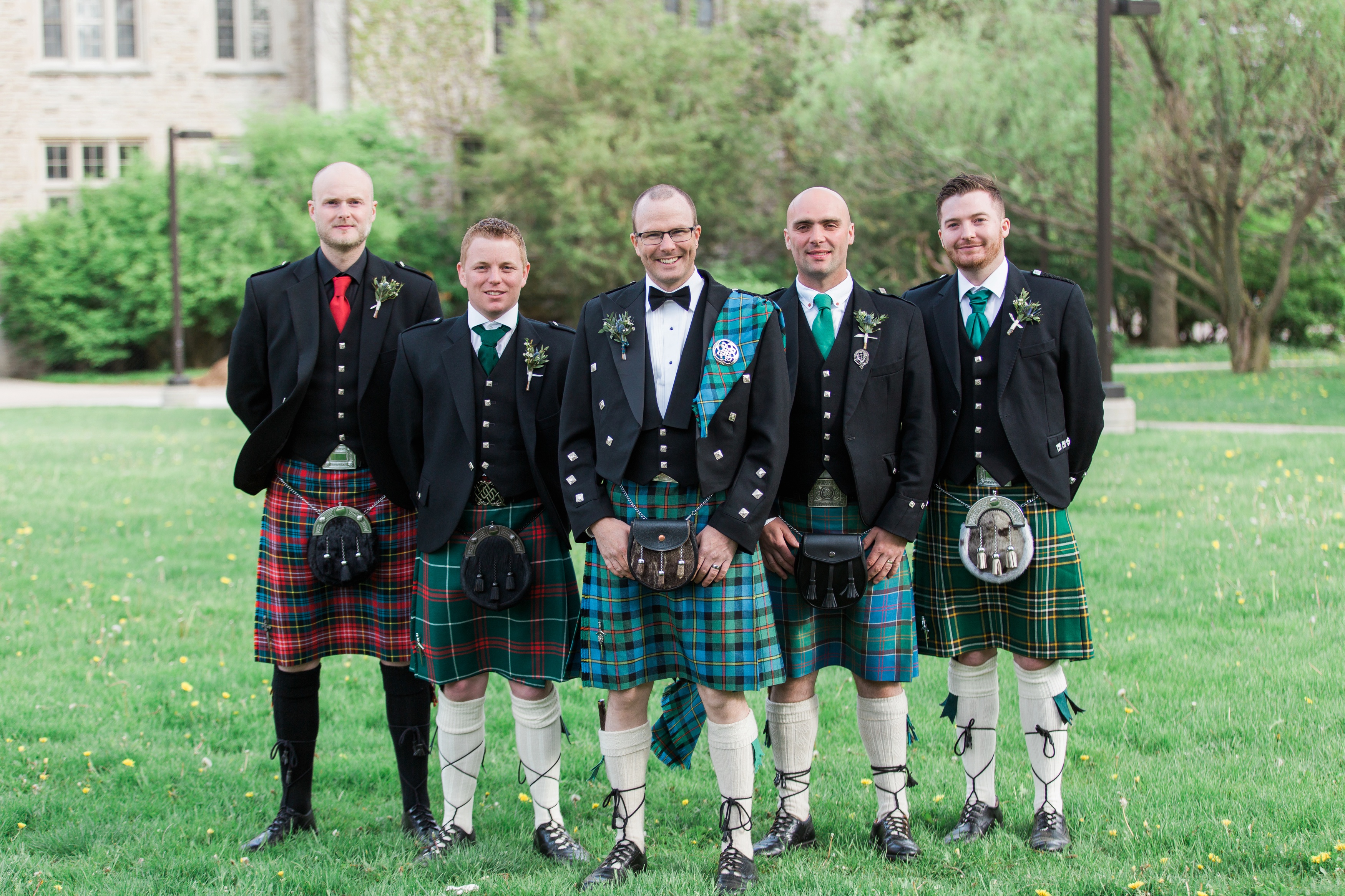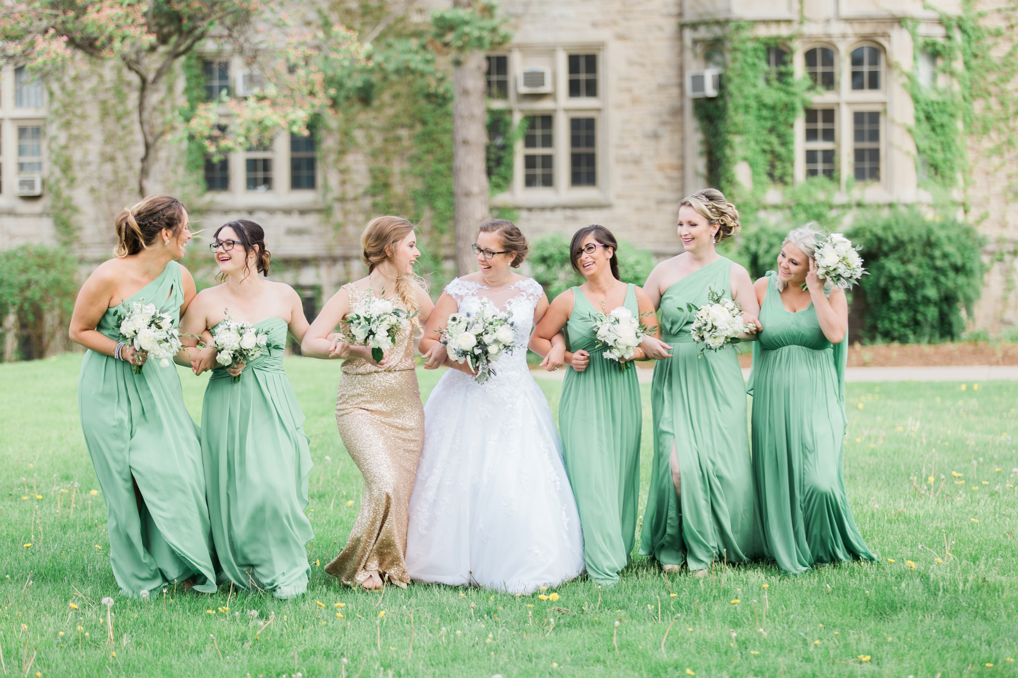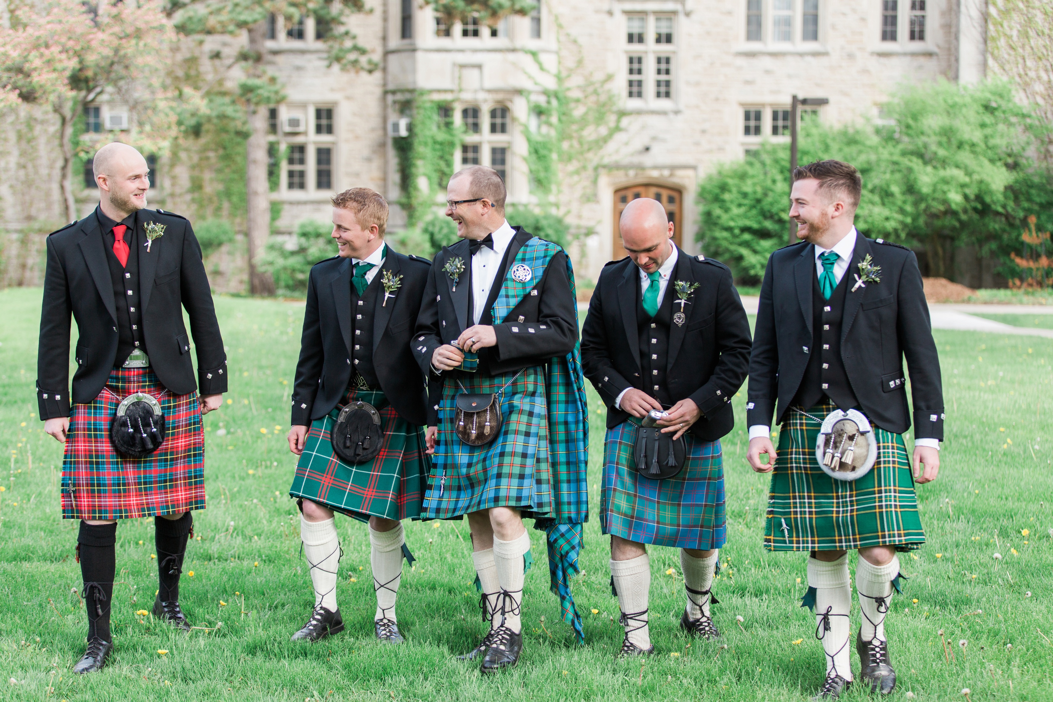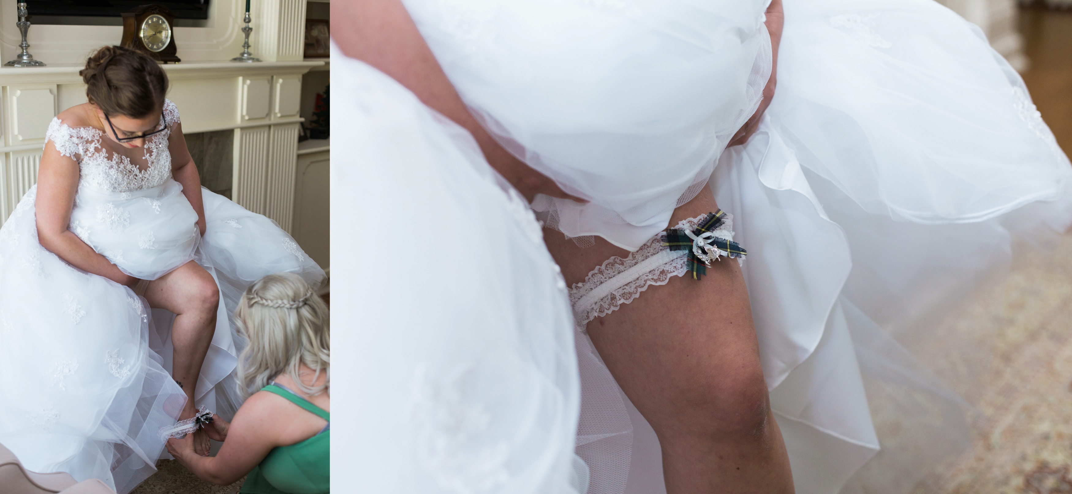 This was my first time photographing a wedding at the University of Guelph in Guelph, Ontario. However, it was the most perfect backdrop for Sam & Alex’s Scottish Wedding. Where do I even begin with this wedding. There are so many wonderful moments and memories that I can share with you about my journey with this couple but I think we will just start from the wedding day. My day began with Sam and the ladies at her Uncle Gary’s home in Guelph. Upon arrival, the ladies were all finished getting dolled up and Sam was a glowing bride to be. Like most weddings, I start with bridal details. This included any jewellery, florals, stationary that the bride may be wearing or using throughout the day. I always get a photo of the bridal gown on its own also. I was so in love with Sam’s gown from the minute she brought it out. The beading, the lace and the straps! I love bridal gowns with straps. I think they are feminine, elegant and timeless. Once we captured all the details it was time for the ladies to get dressed. Sam did an excellent job selecting the attire for her bridal party. Her sister, who was also the maid of honour, wore a beautiful gold sequin gown to offset the bridesmaids green gowns. Alex’s sister made Sam a really pretty lace garter. This was a very sweet touch on her wedding day. With everyone dressed in their gowns and bags all packed up for the limo, courtesy of Brentwood Livery, we made our way to the University of Guelph for the ceremony.