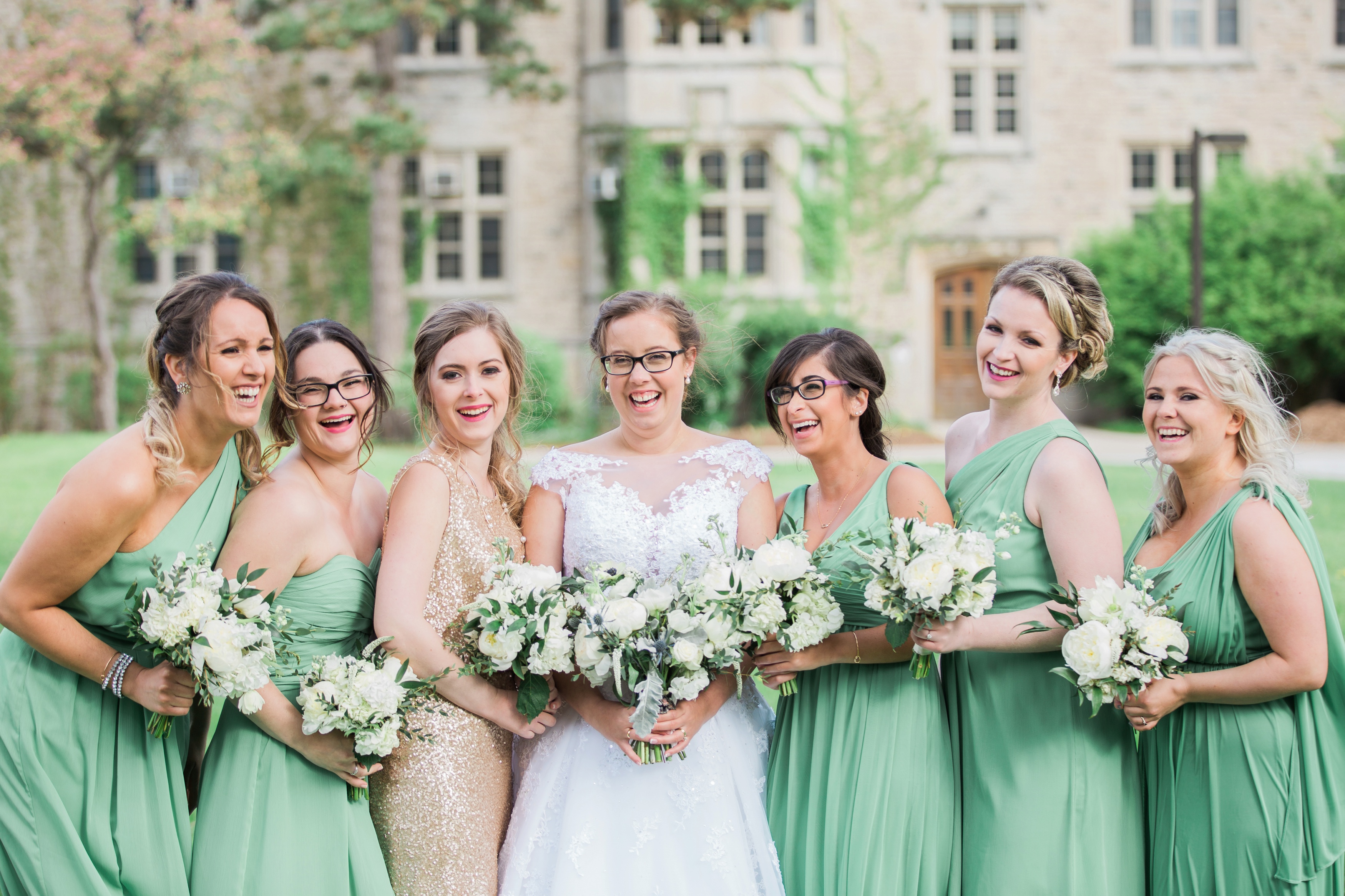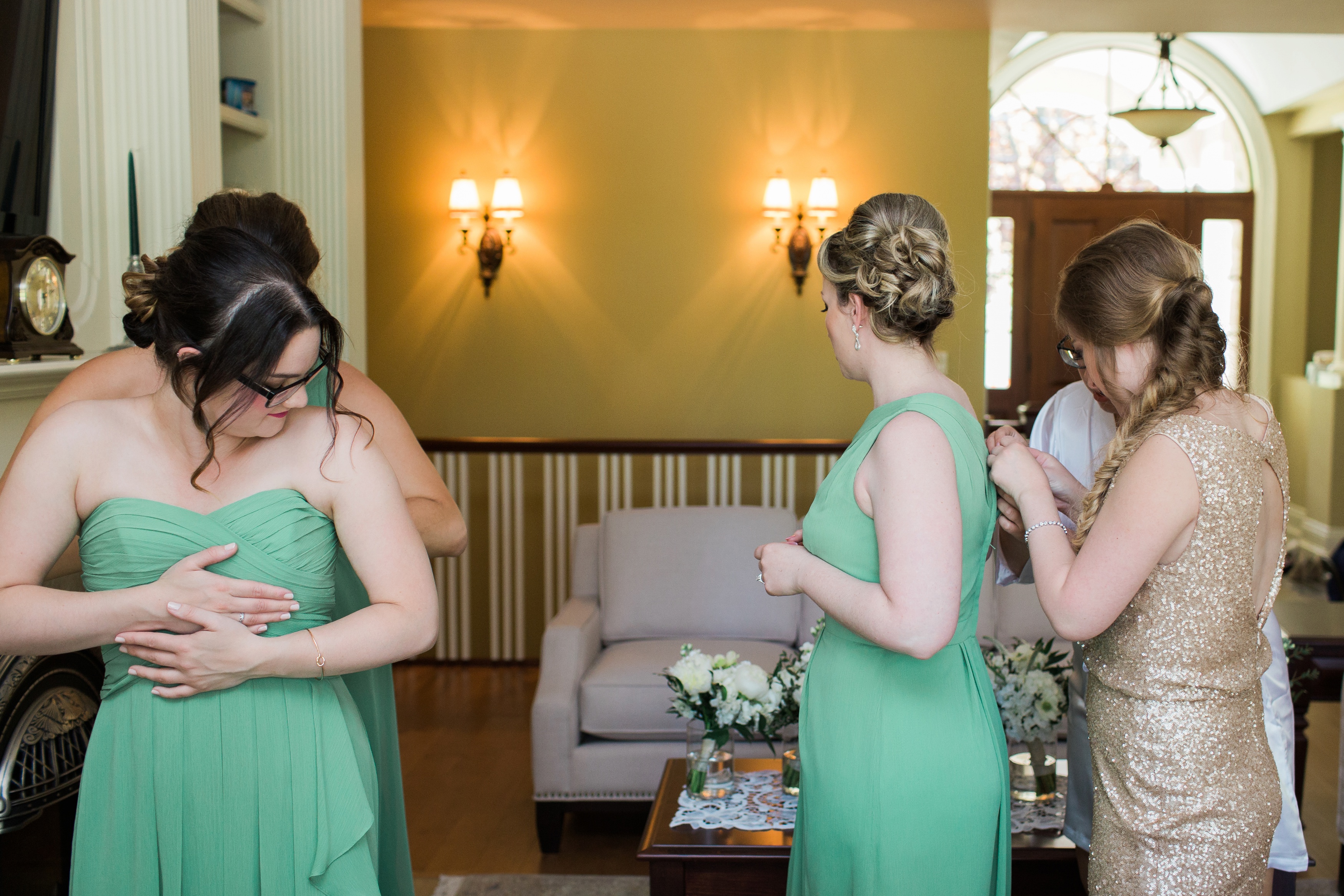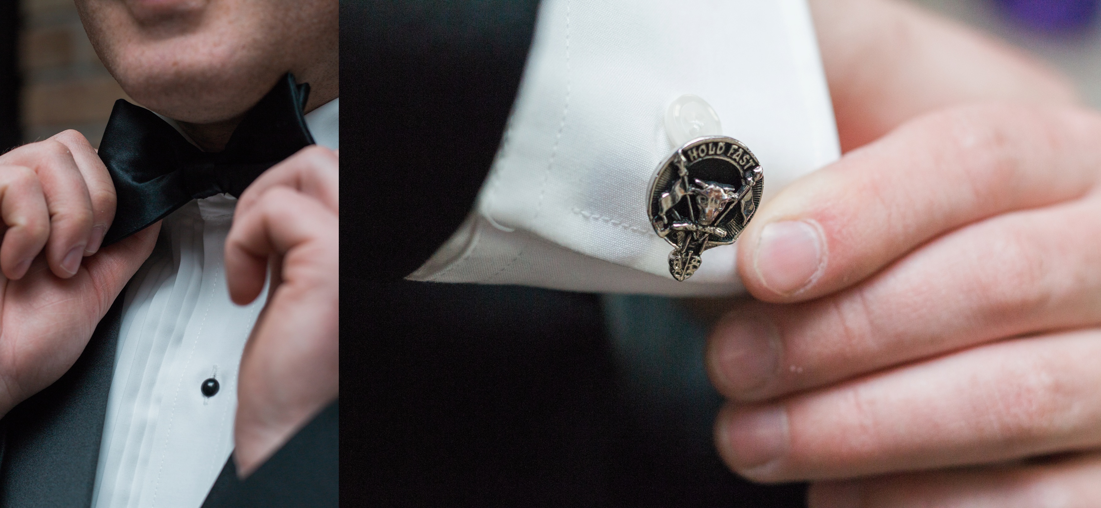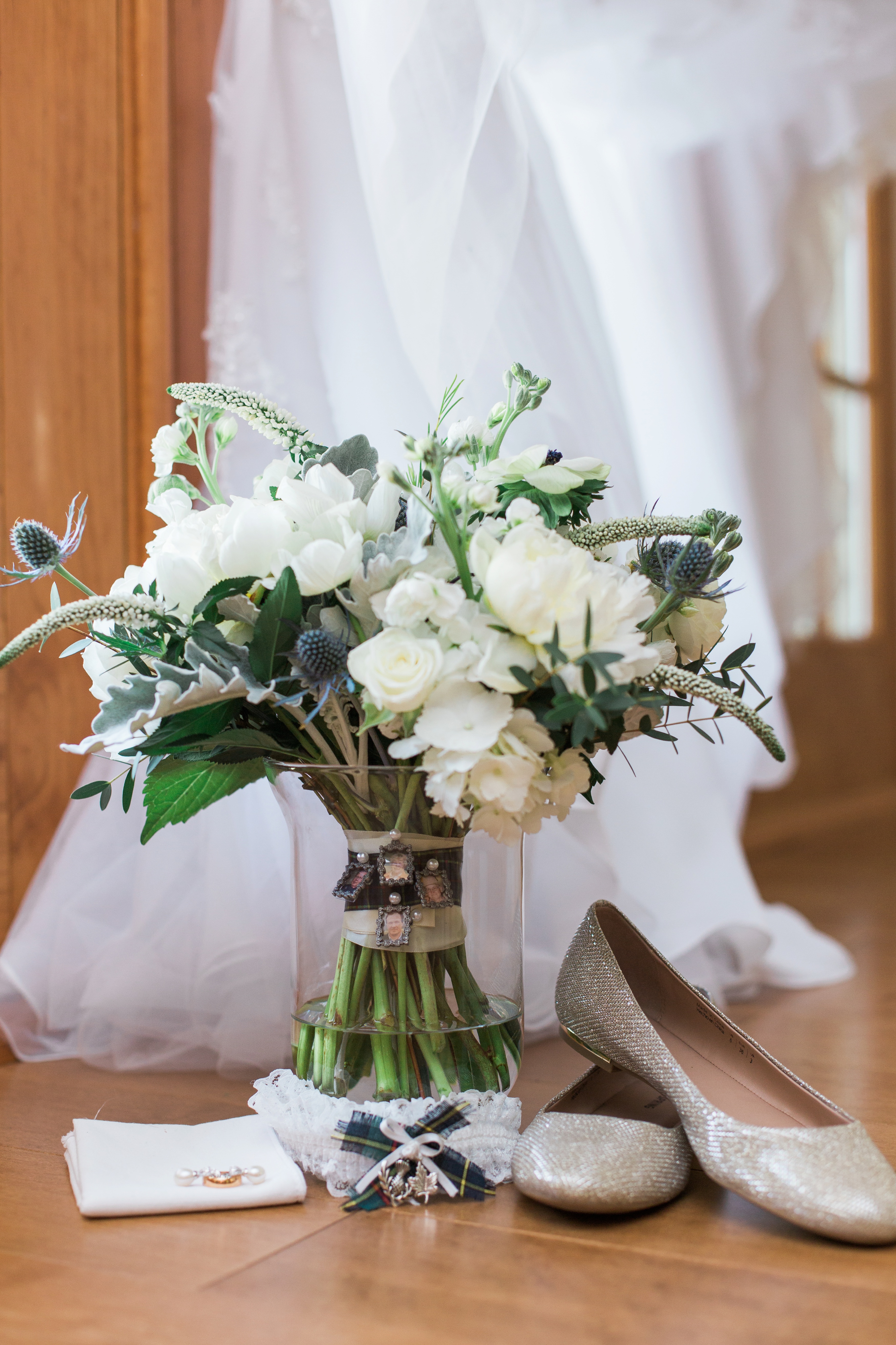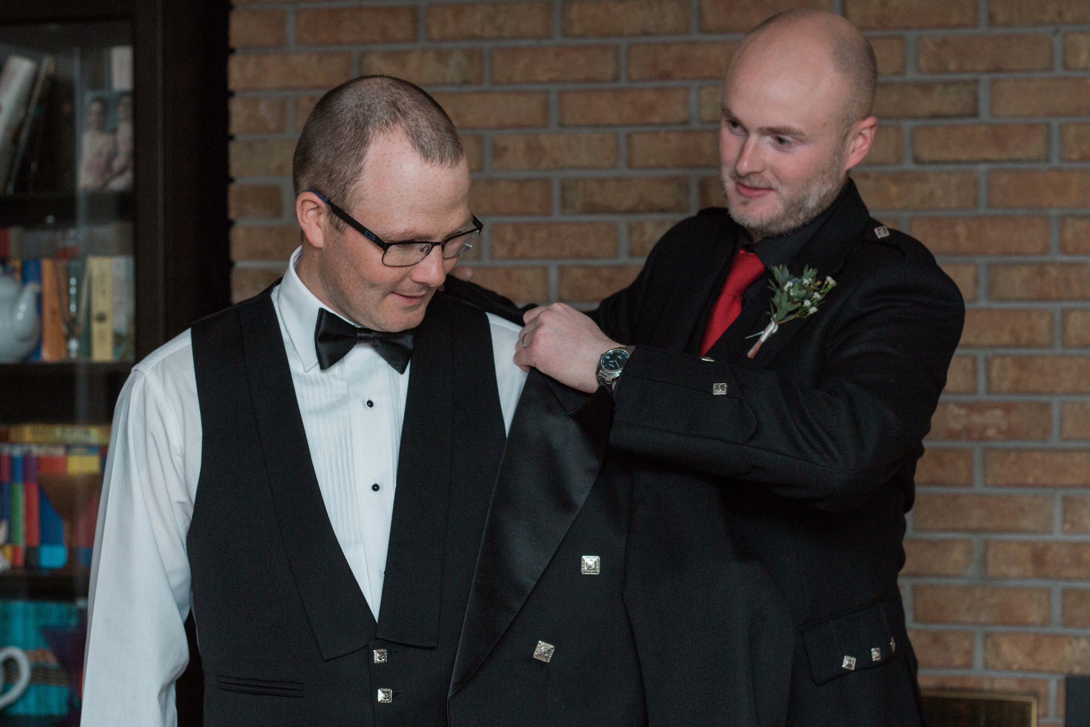 This was my first time photographing a wedding at the University of Guelph in Guelph, Ontario. However, it was the most perfect backdrop for Sam & Alex’s Scottish Wedding. Where do I even begin with this wedding. There are so many wonderful moments and memories that I can share with you about my journey with this couple but I think we will just start from the wedding day. My day began with Sam and the ladies at her Uncle Gary’s home in Guelph. Upon arrival, the ladies were all finished getting dolled up and Sam was a glowing bride to be. Like most weddings, I start with bridal details. This included any jewellery, florals, stationary that the bride may be wearing or using throughout the day. I always get a photo of the bridal gown on its own also. I was so in love with Sam’s gown from the minute she brought it out. The beading, the lace and the straps! I love bridal gowns with straps. I think they are feminine, elegant and timeless. Once we captured all the details it was time for the ladies to get dressed. Sam did an excellent job selecting the attire for her bridal party. Her sister, who was also the maid of honour, wore a beautiful gold sequin gown to offset the bridesmaids green gowns. Alex’s sister made Sam a really pretty lace garter. This was a very sweet touch on her wedding day. With everyone dressed in their gowns and bags all packed up for the limo, courtesy of Brentwood Livery, we made our way to the University of Guelph for the ceremony.