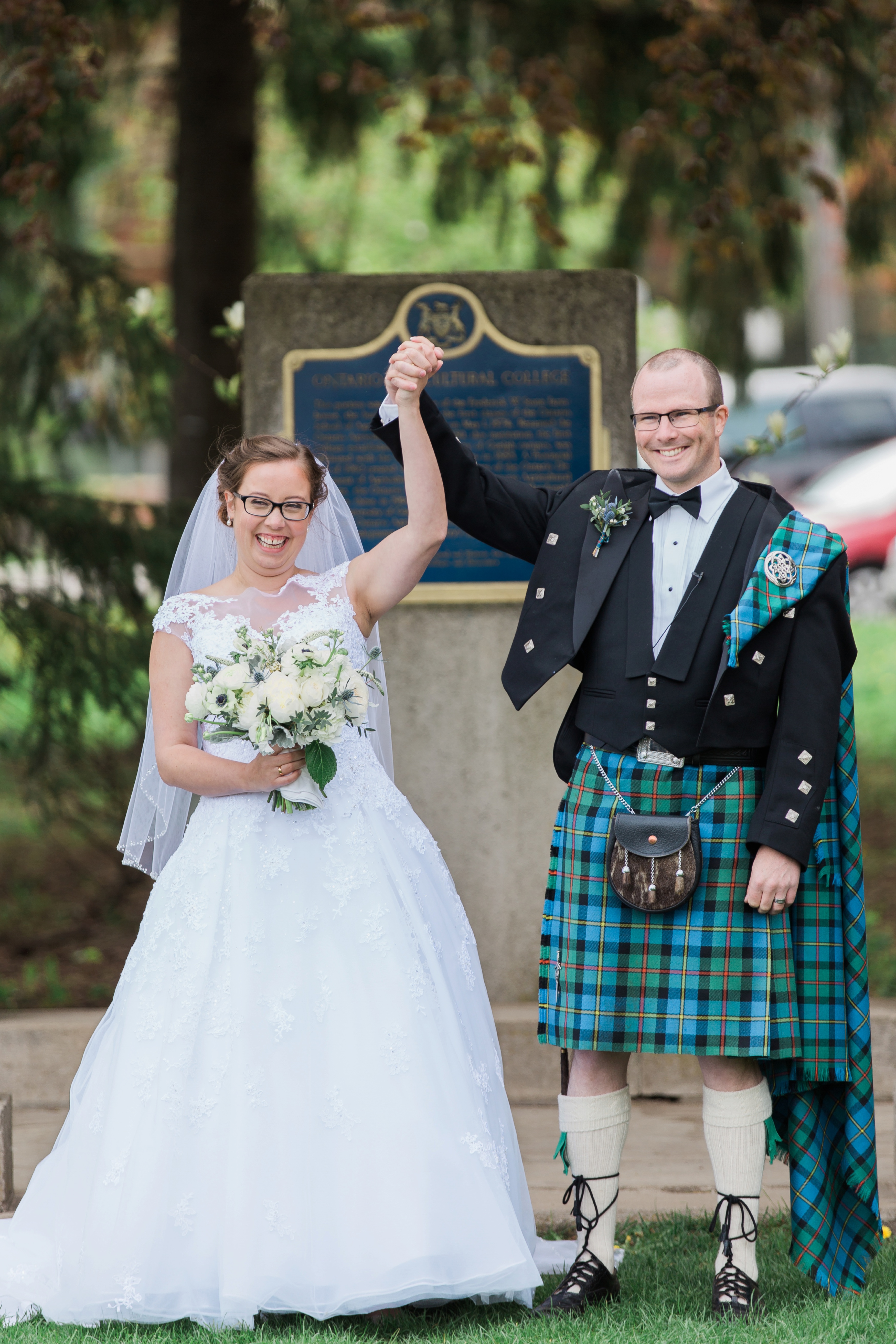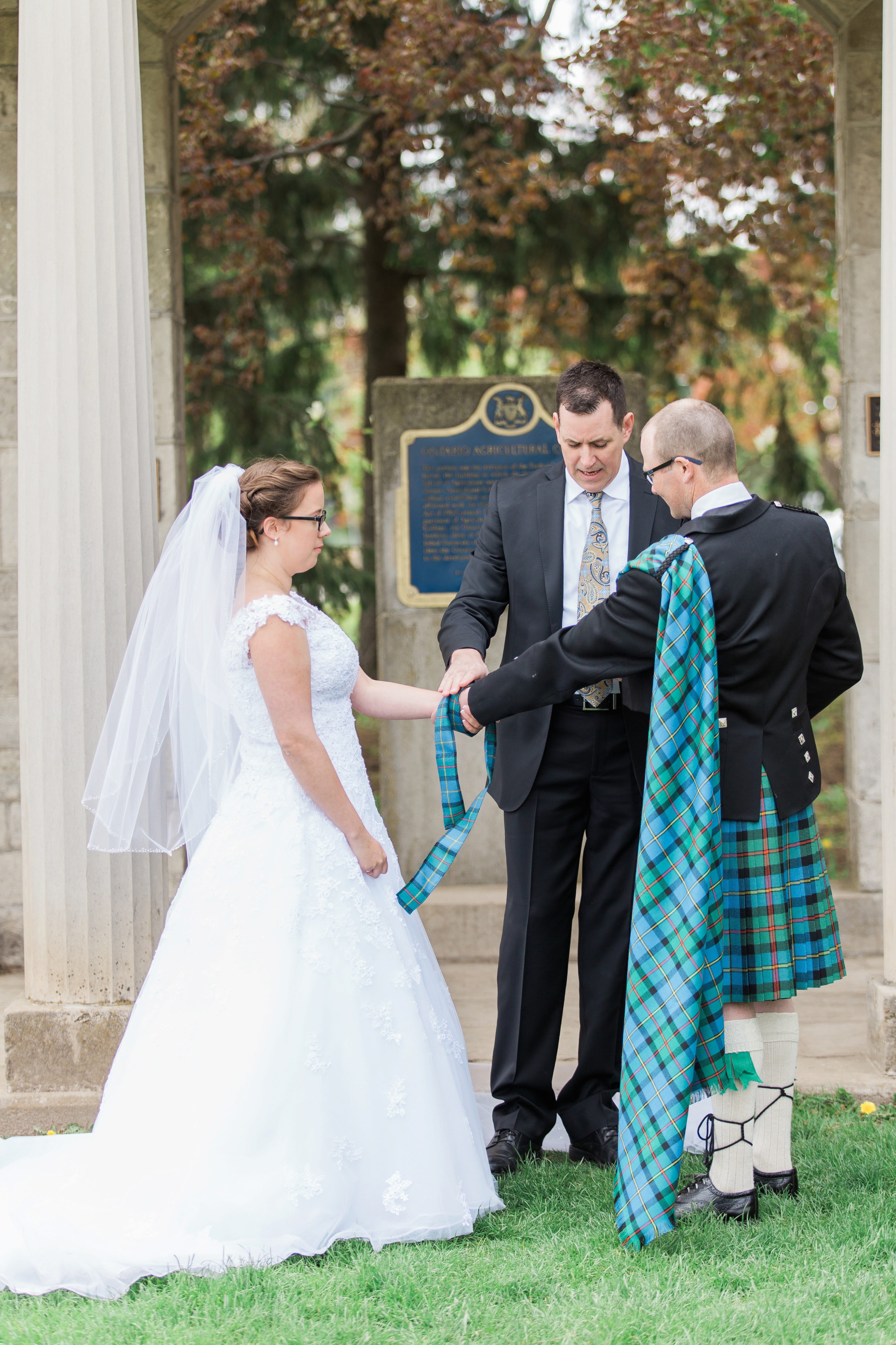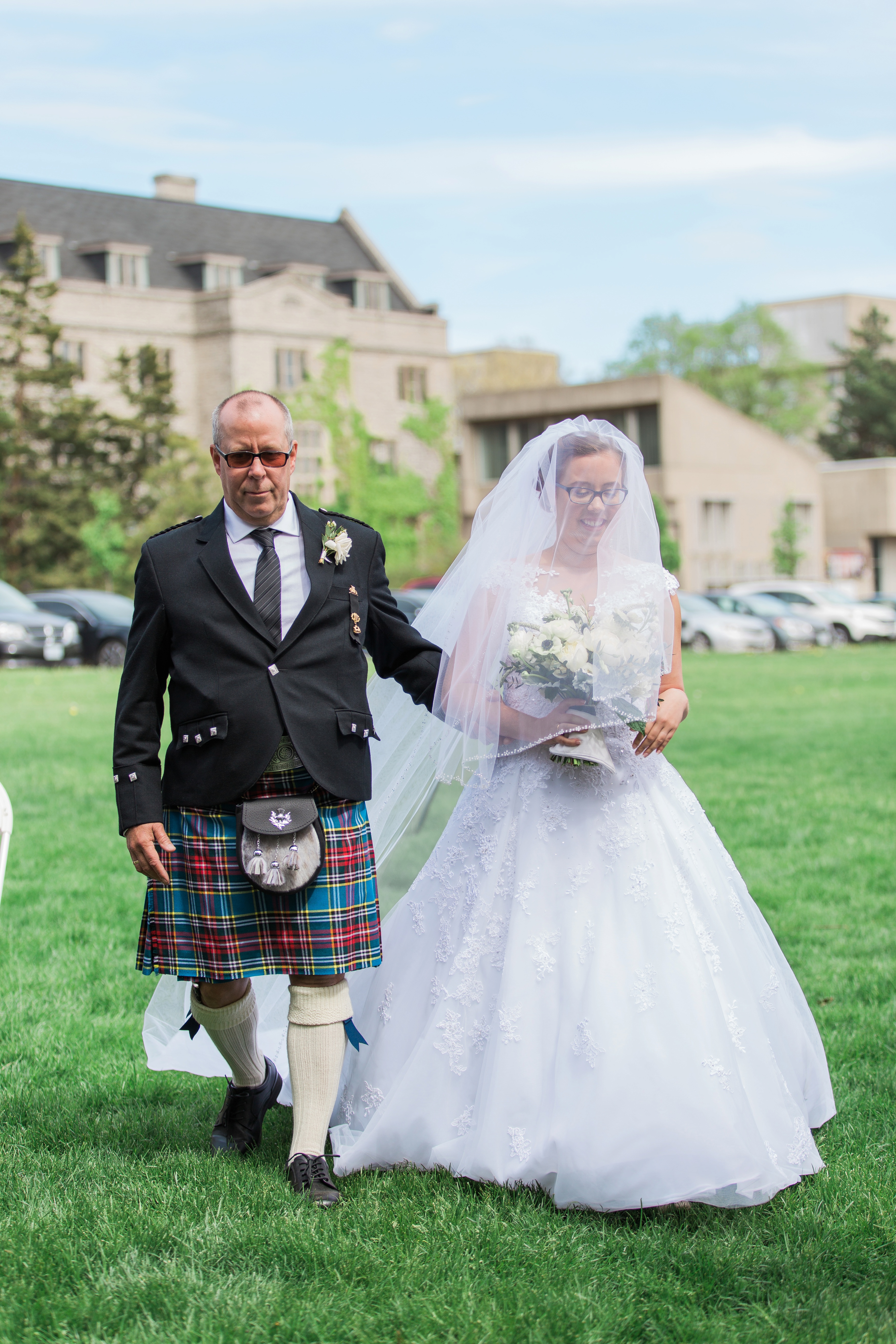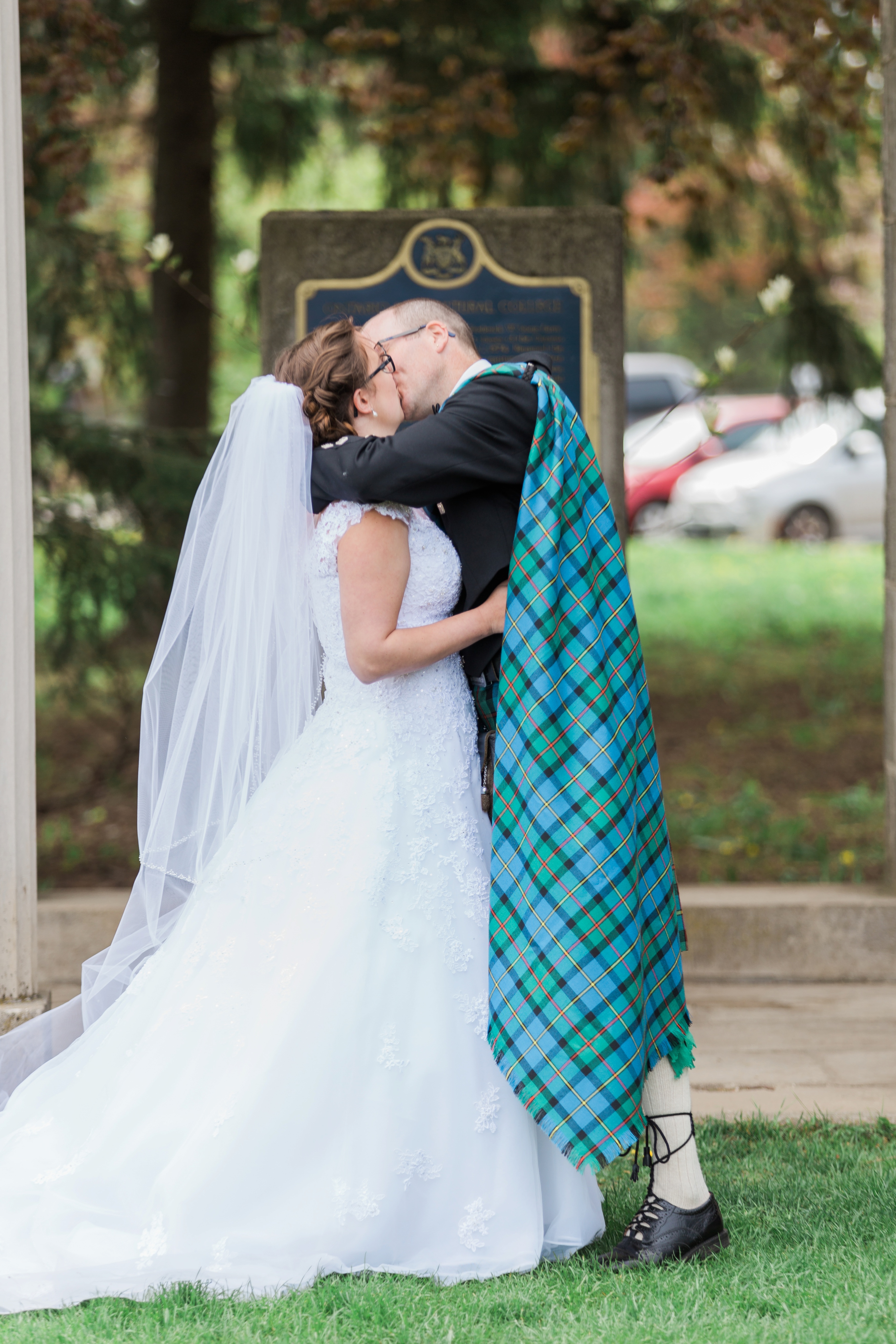 Guests from across the globe made there way to Guelph to celebrate with Sam and Alex. The sun was shining, guests were seated and Alex and the groomsman were dressed in their kilts and ready to begin. There ceremony was short and sweet and there was no shortage of tears or laughs. I really love when couples choose to write their own vows. It is something I wish that I would have done for my own wedding. I think my favourite moment of the ceremony was near the end right after they signed their marriage license. While Sam and Alex stood off to the side, Sam showed Alex her bouquet and the photos that were attached. Included in the bunch of images was a photo of Alex’s Dad. Sadly, his Dad had passed away before he could see his son get married. It was at this point that Alex broke down in happy tears. What a great surprise and sentiment that Sam had done for him. I should also mention, I may have shed a few tears myself. It was a very touching moment to see. I am not sure how many people witnessed this moment but I was sure glad I was able to capture it.