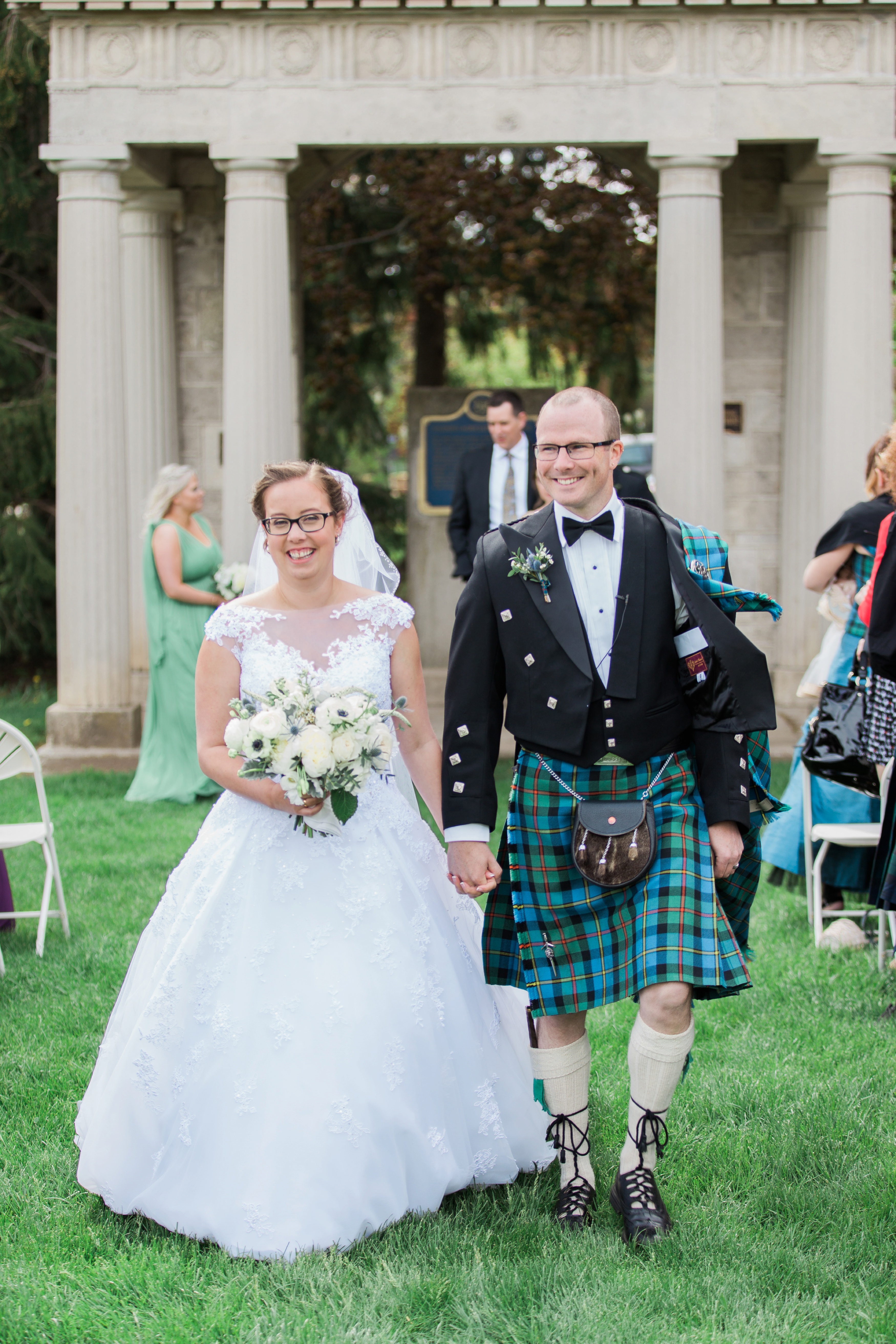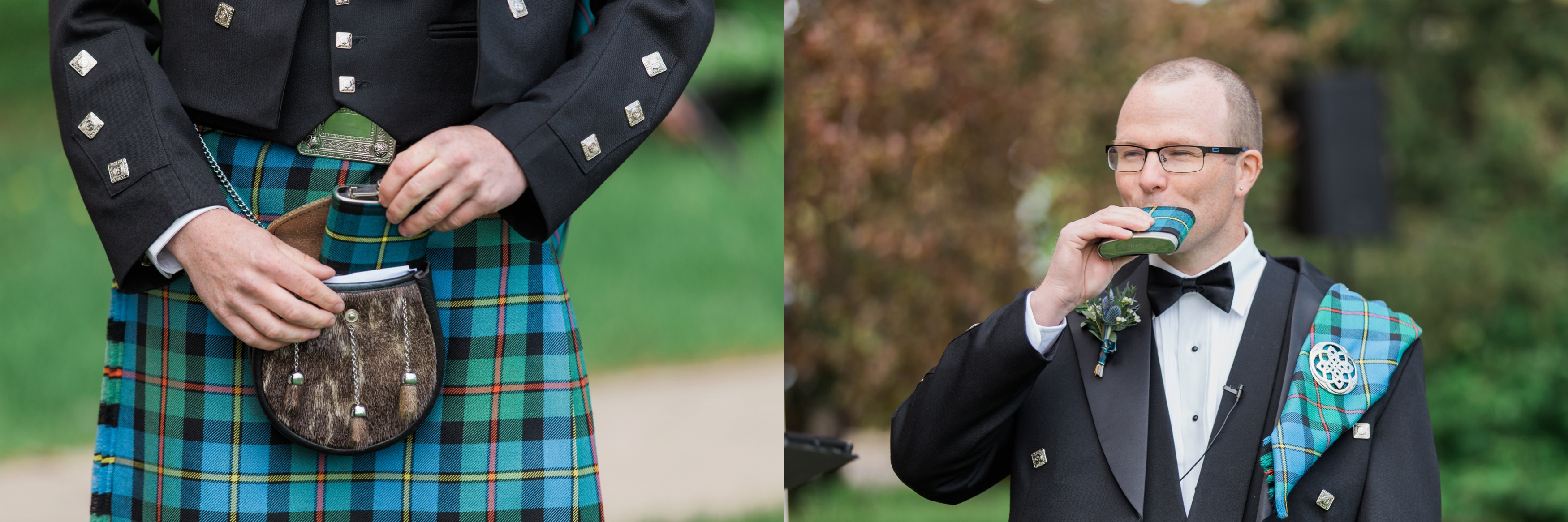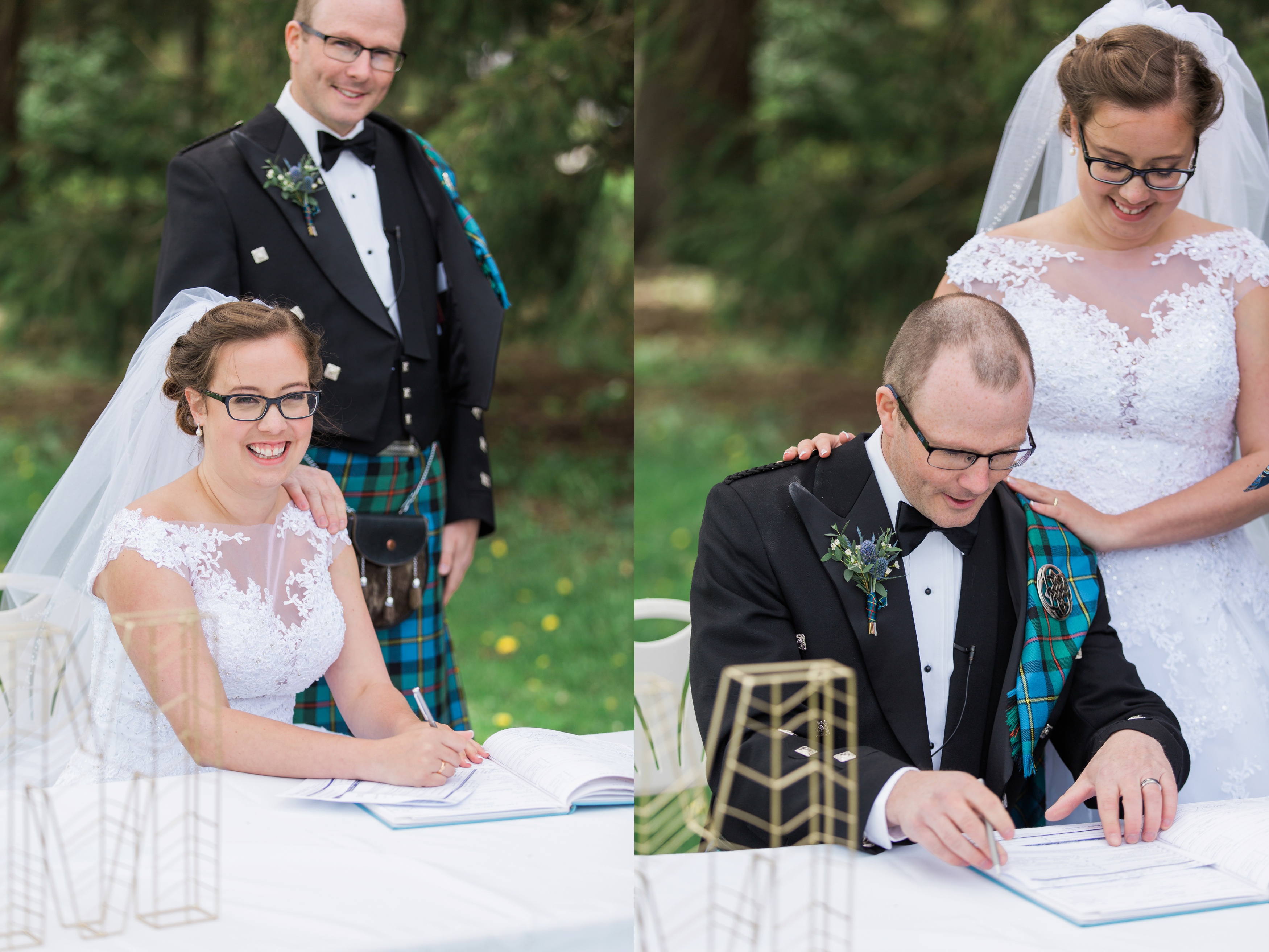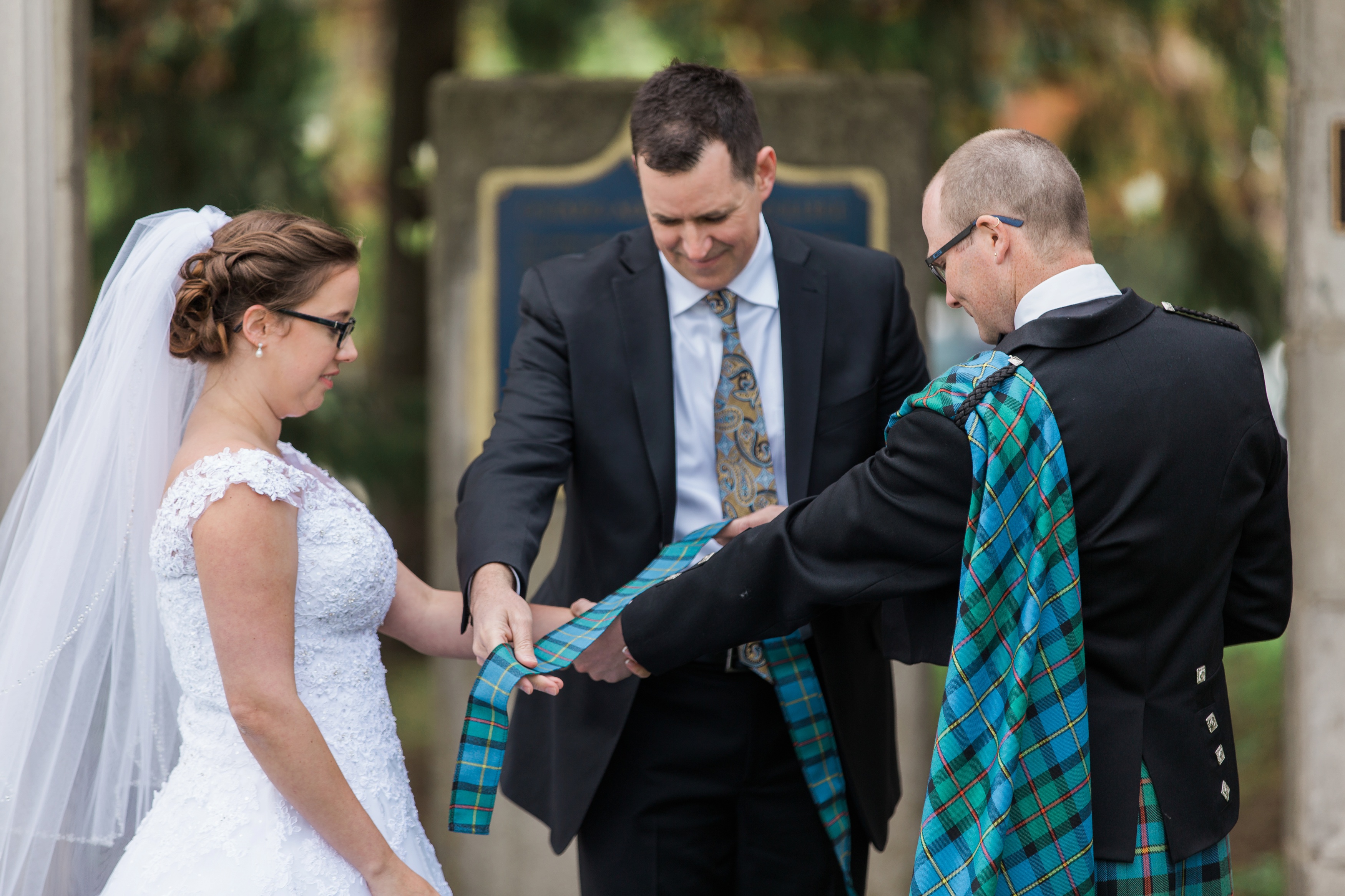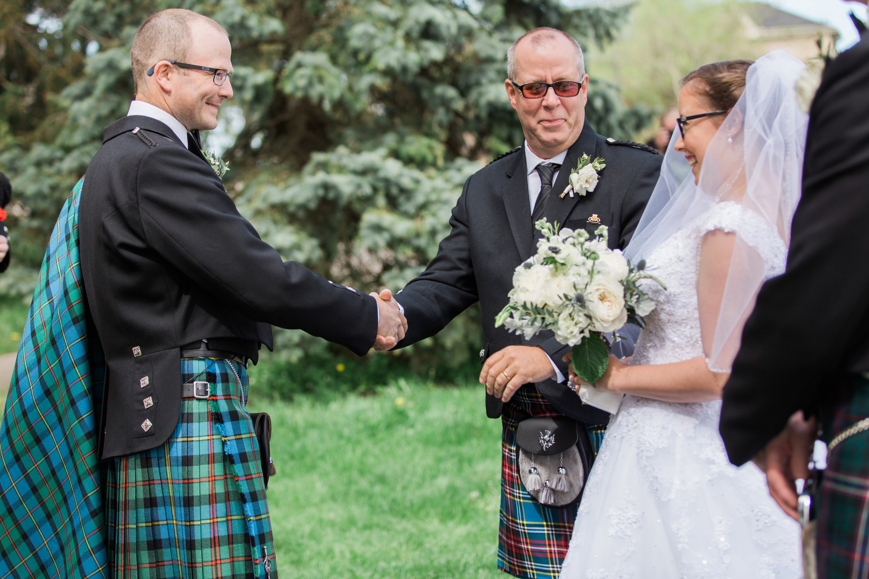 Guests from across the globe made there way to Guelph to celebrate with Sam and Alex. The sun was shining, guests were seated and Alex and the groomsman were dressed in their kilts and ready to begin. There ceremony was short and sweet and there was no shortage of tears or laughs. I really love when couples choose to write their own vows. It is something I wish that I would have done for my own wedding. I think my favourite moment of the ceremony was near the end right after they signed their marriage license. While Sam and Alex stood off to the side, Sam showed Alex her bouquet and the photos that were attached. Included in the bunch of images was a photo of Alex’s Dad. Sadly, his Dad had passed away before he could see his son get married. It was at this point that Alex broke down in happy tears. What a great surprise and sentiment that Sam had done for him. I should also mention, I may have shed a few tears myself. It was a very touching moment to see. I am not sure how many people witnessed this moment but I was sure glad I was able to capture it.
