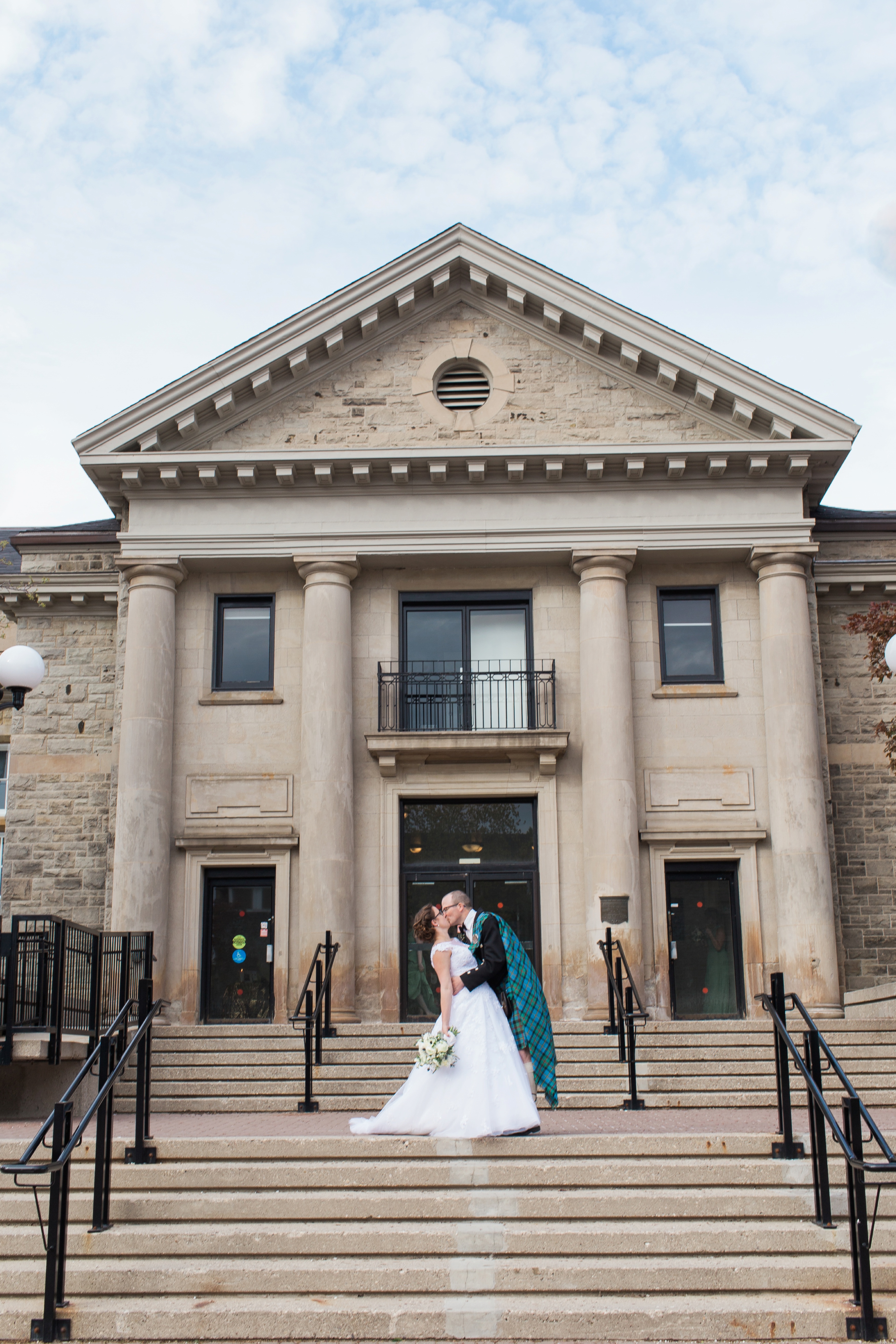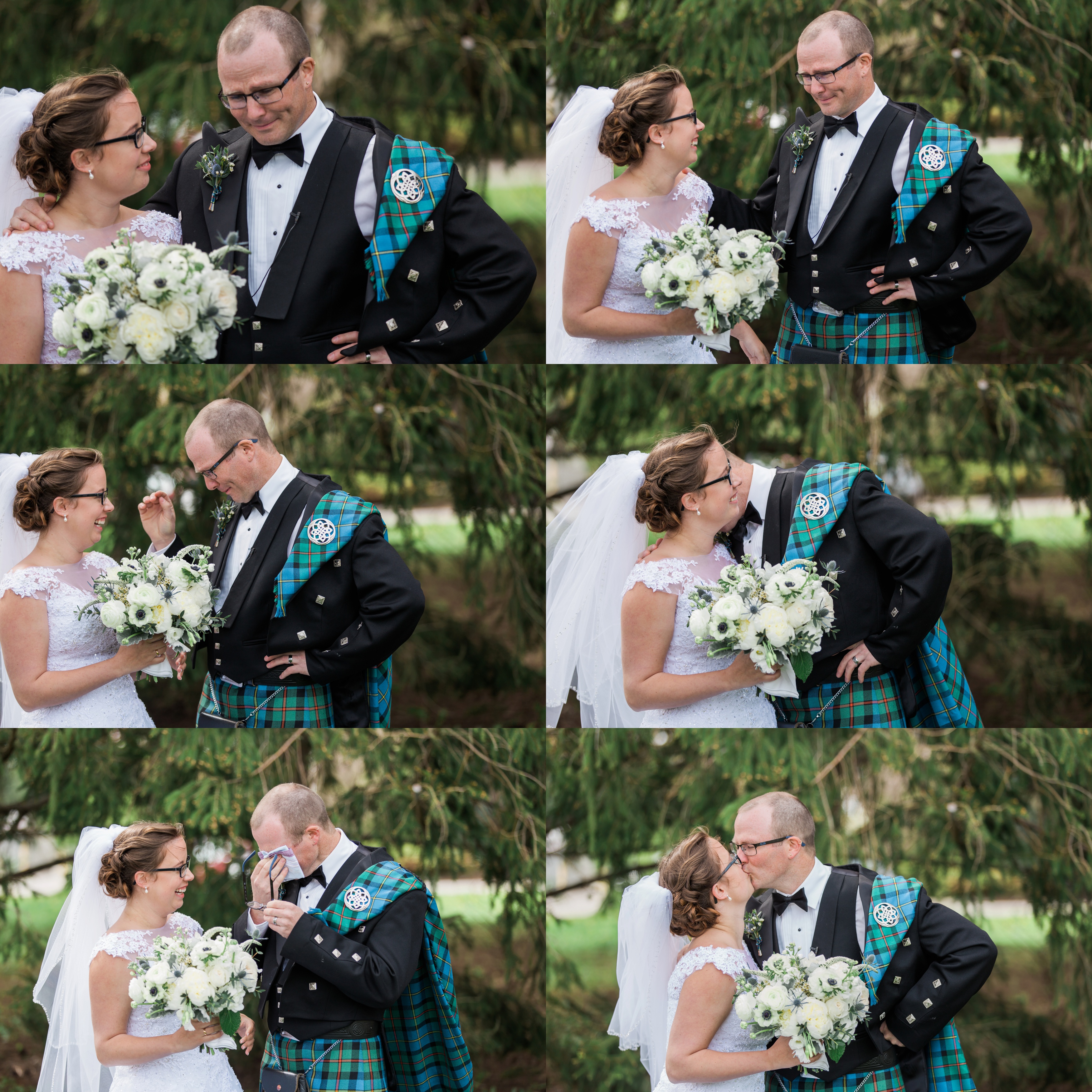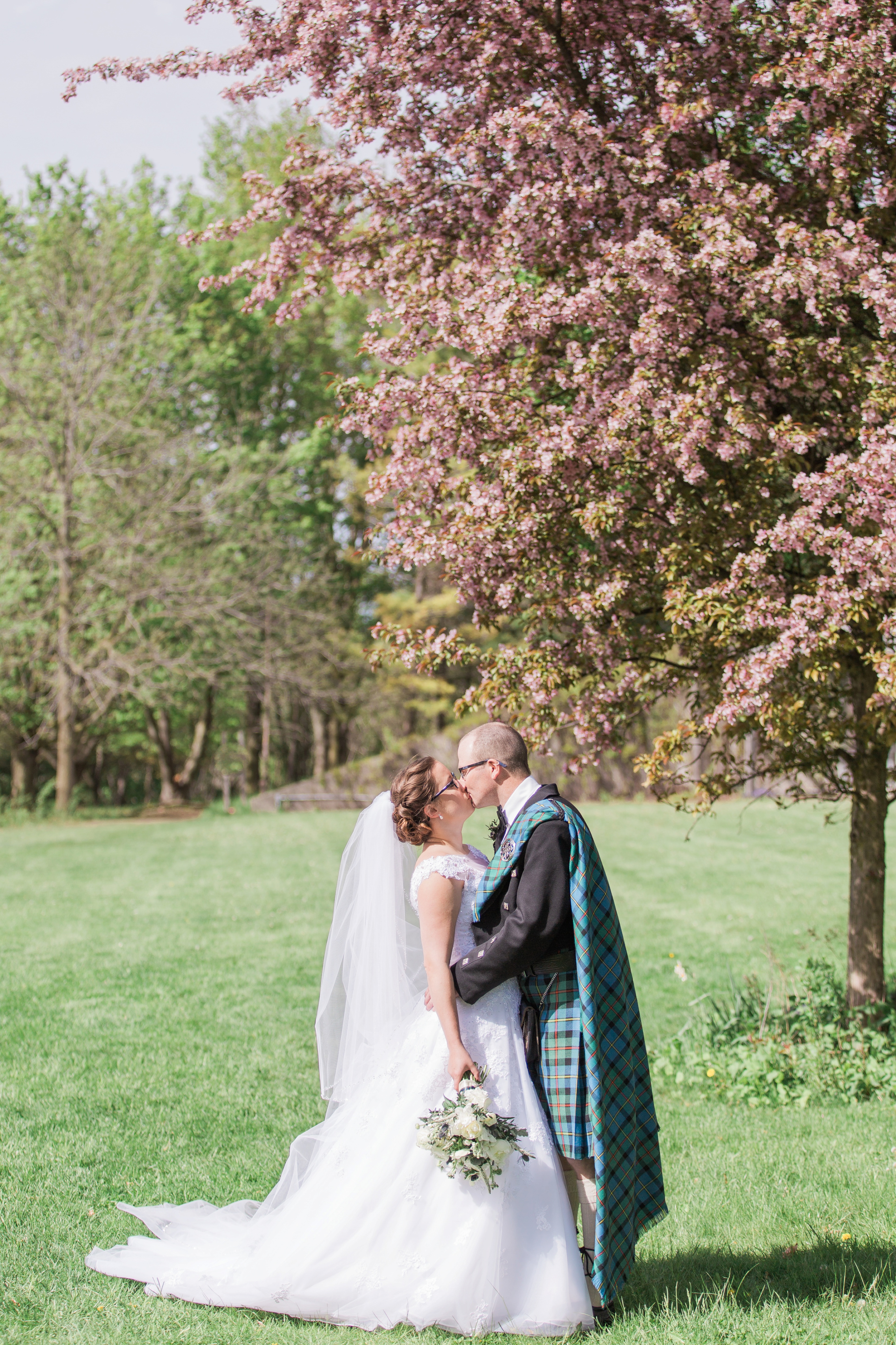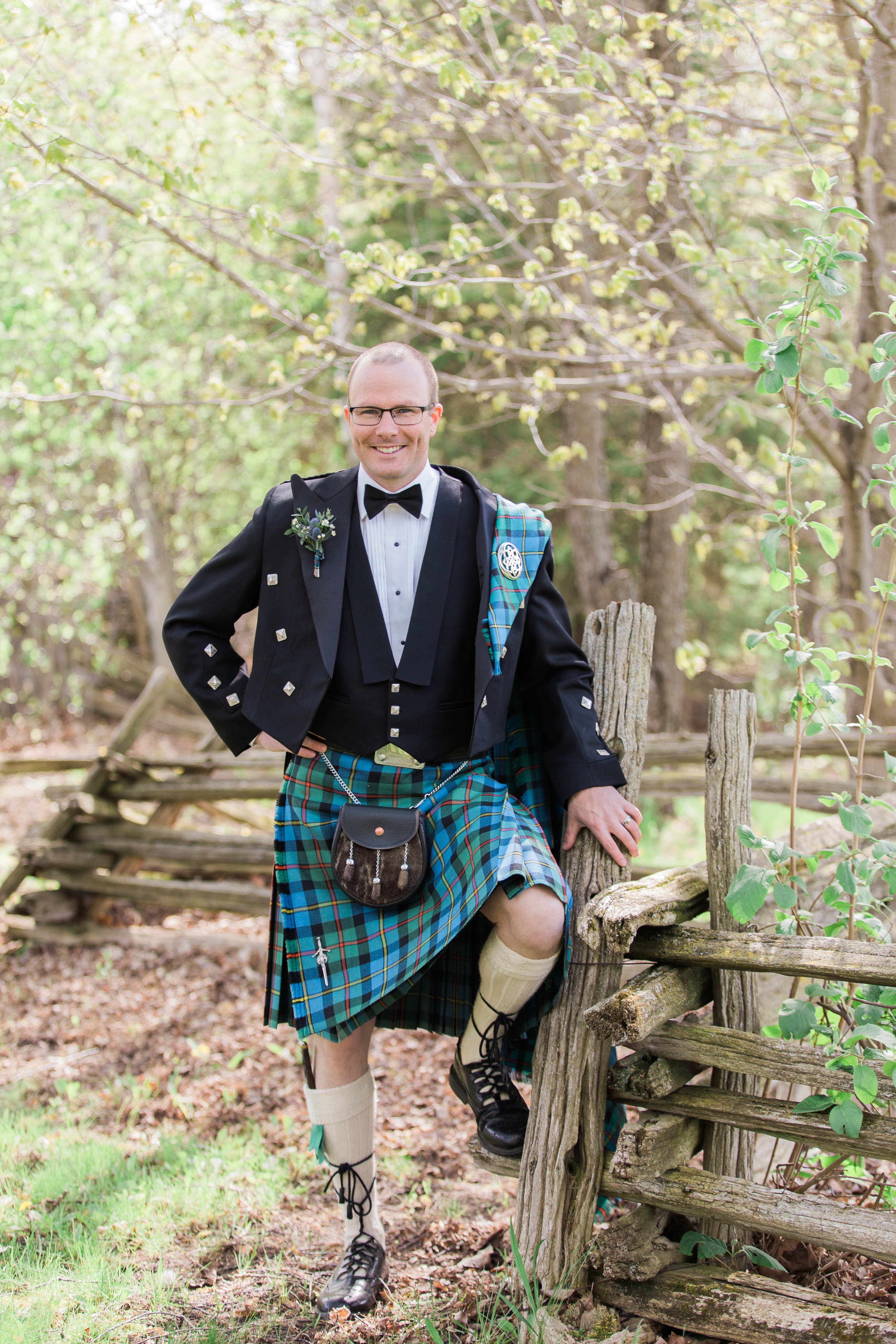 Guests from across the globe made there way to Guelph to celebrate with Sam and Alex. The sun was shining, guests were seated and Alex and the groomsman were dressed in their kilts and ready to begin. There ceremony was short and sweet and there was no shortage of tears or laughs. I really love when couples choose to write their own vows. It is something I wish that I would have done for my own wedding. I think my favourite moment of the ceremony was near the end right after they signed their marriage license. While Sam and Alex stood off to the side, Sam showed Alex her bouquet and the photos that were attached. Included in the bunch of images was a photo of Alex’s Dad. Sadly, his Dad had passed away before he could see his son get married. It was at this point that Alex broke down in happy tears. What a great surprise and sentiment that Sam had done for him. I should also mention, I may have shed a few tears myself. It was a very touching moment to see. I am not sure how many people witnessed this moment but I was sure glad I was able to capture it.
