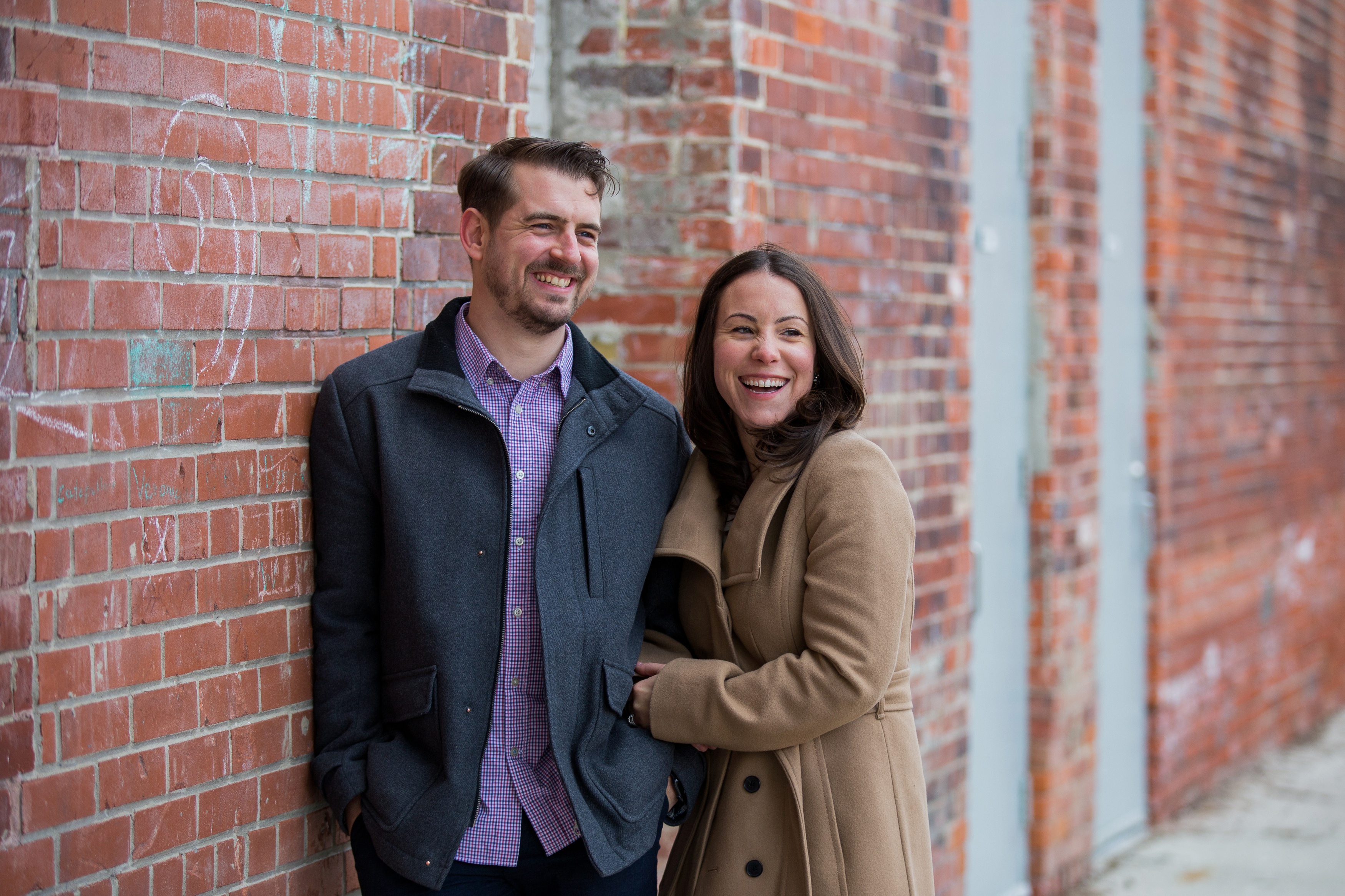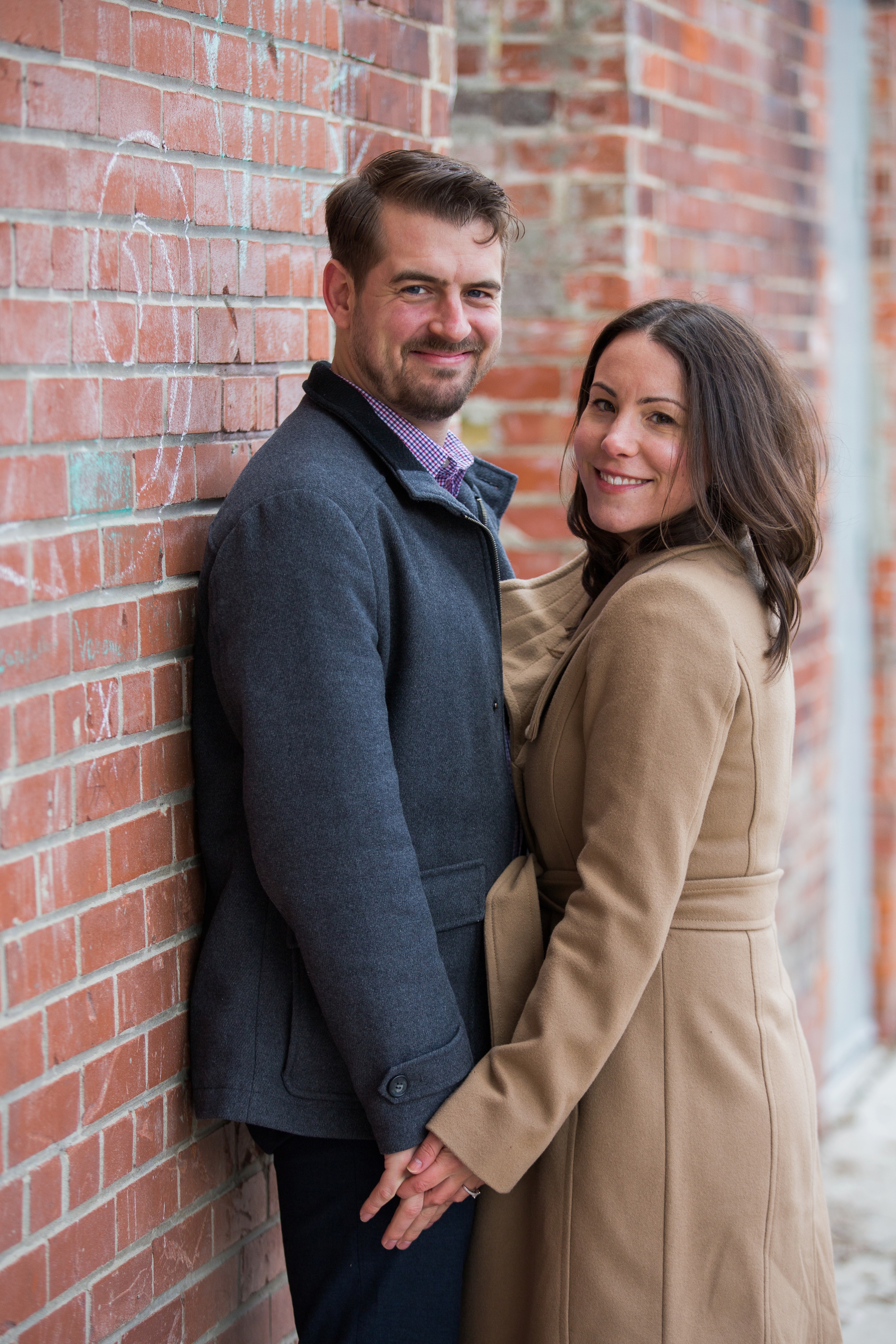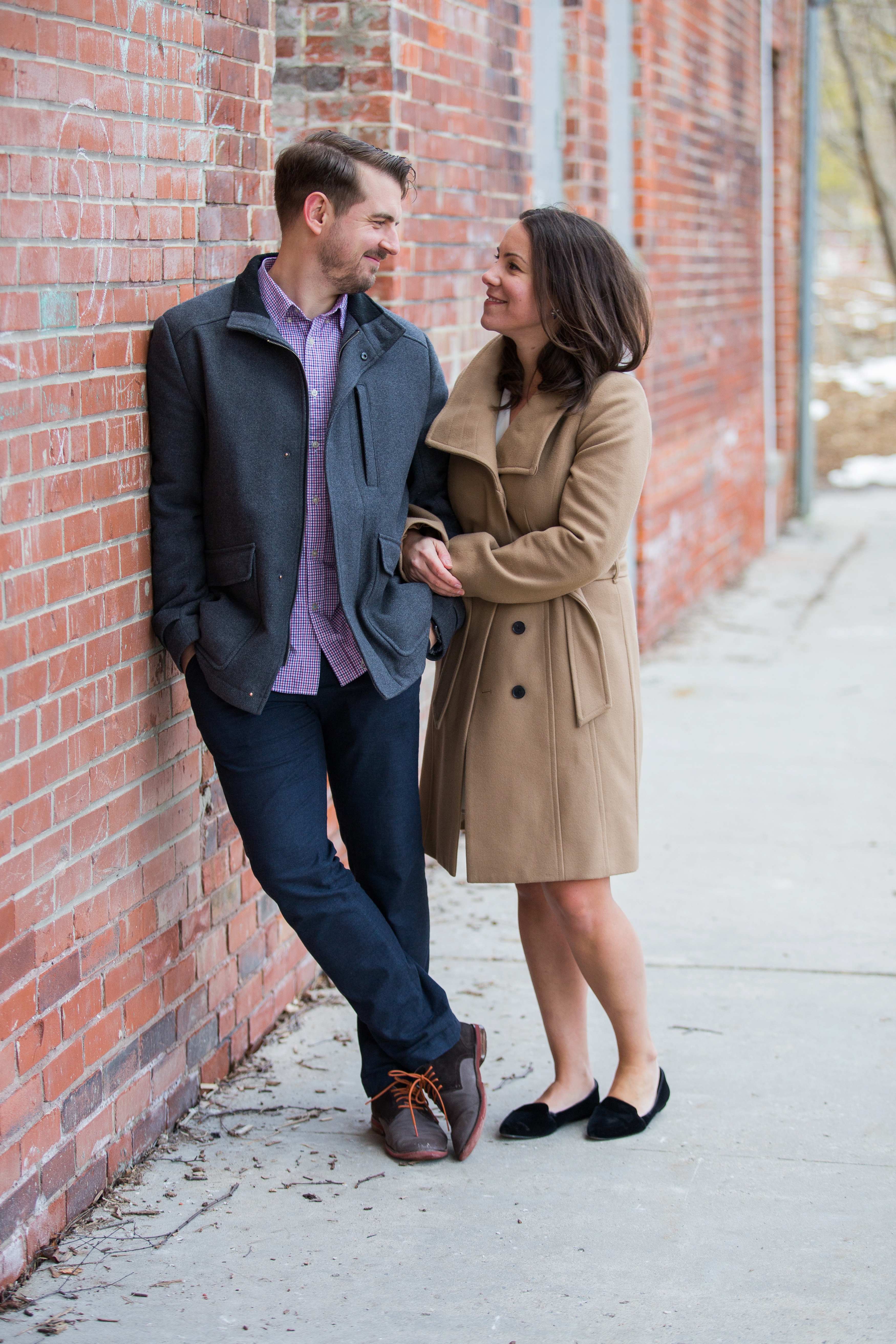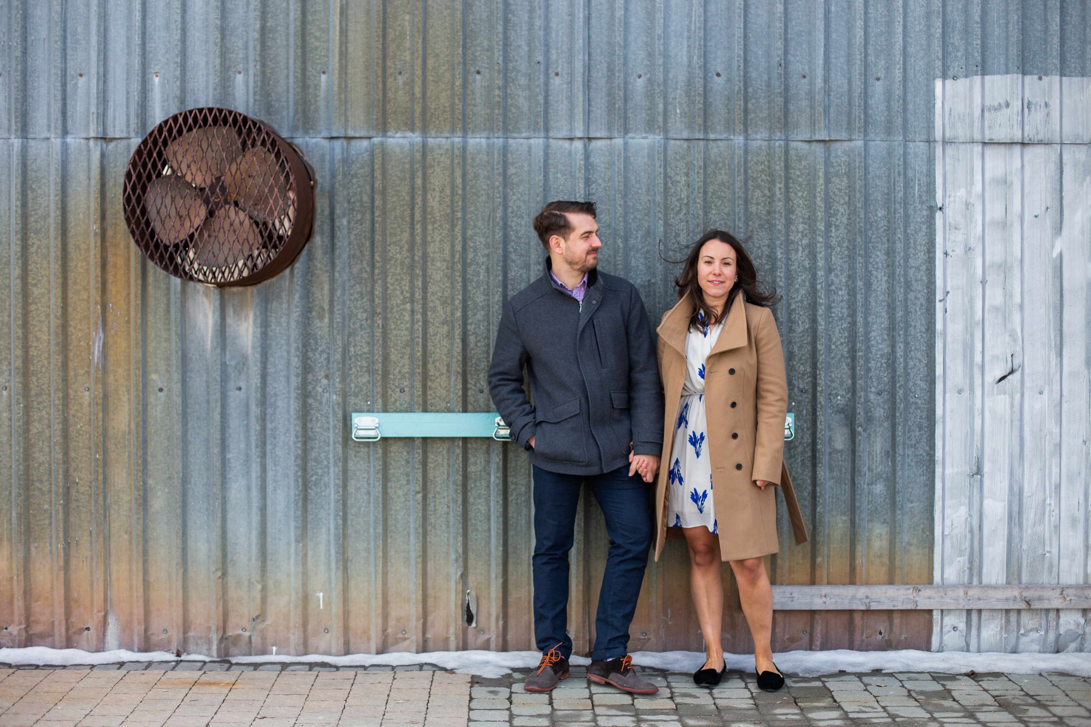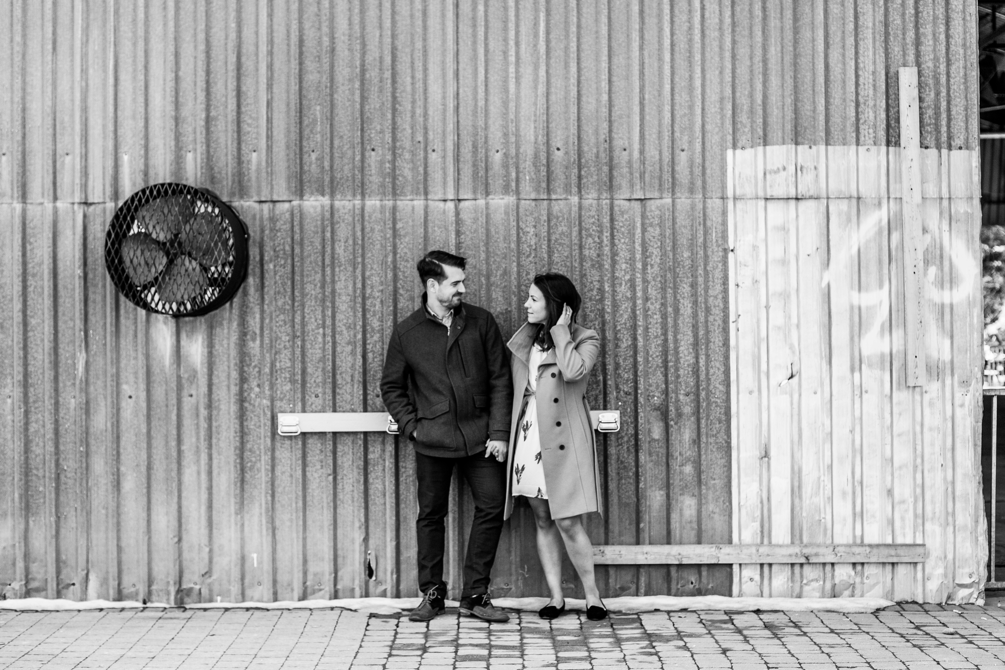 Evergreen Brick Works in Toronto, Ontario is a very cool place. With so many great textures like brick, steel and wood it offered endless backdrops for this Toronto engagement session. I do not travel into Toronto very often for engagement sessions or weddings but sure am glad I did. Kate and Jesse are local to Toronto. However, Jesse is originally from Kitchener, Ontario and Kate, Toronto. They met in University in Waterloo, Ontario. They have since made their way back to the city life. While they live the city life, they have chosen to have their rustic wedding in Kitchener at Steckle Heritage Farm this summer. I had asked they why they chose a farm as their wedding venue since they are city people. The answer was simple, they just fell in love with it when they did a walk through. Which I totally get, it is an awesome venue.