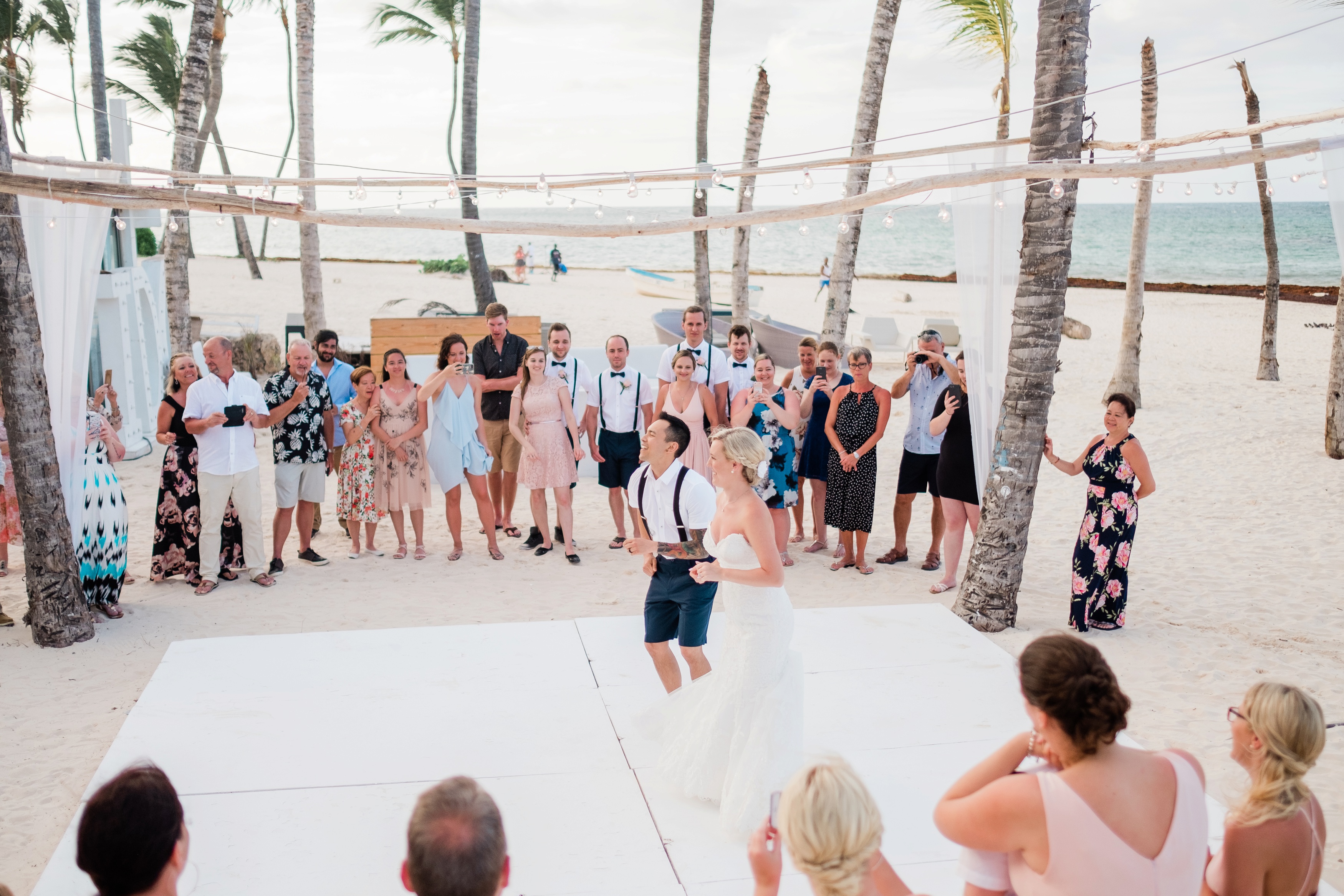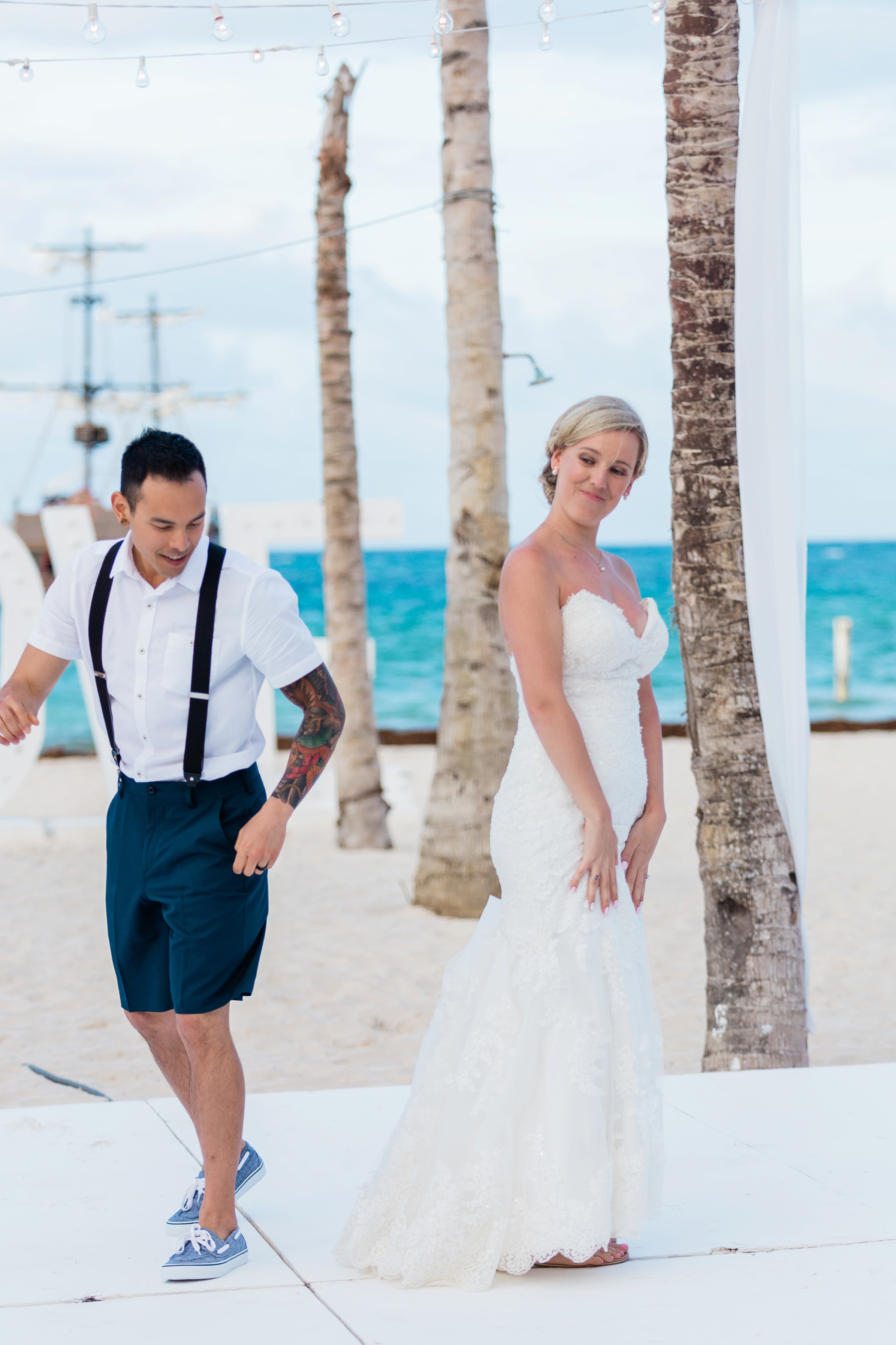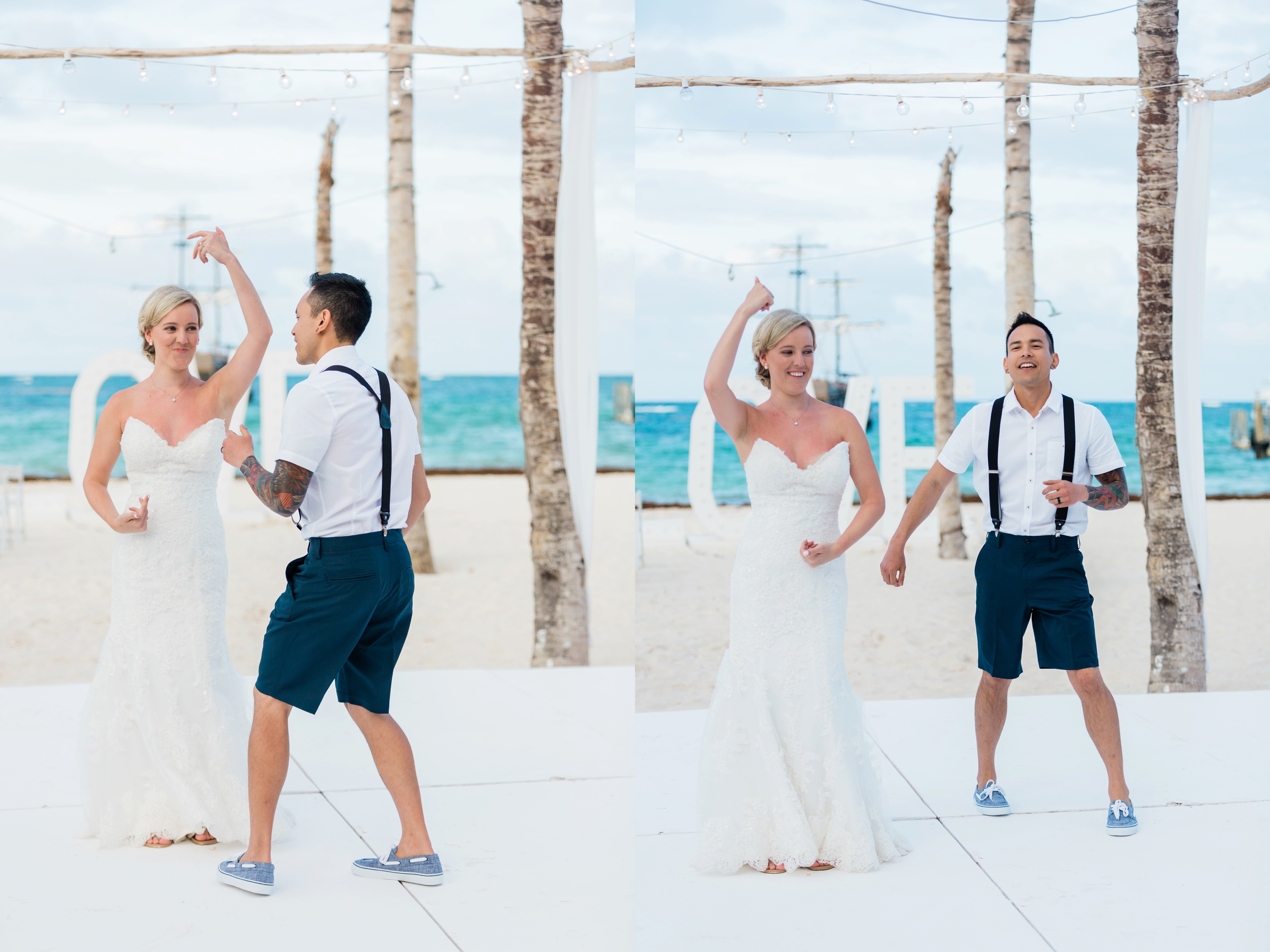 Under the string lights on the beach, the newlyweds shared in their first dance. It was a surprise to everyone that they took dance lessions for a fun choreographed performance. Just like the pair of them, it was fun and exciting.